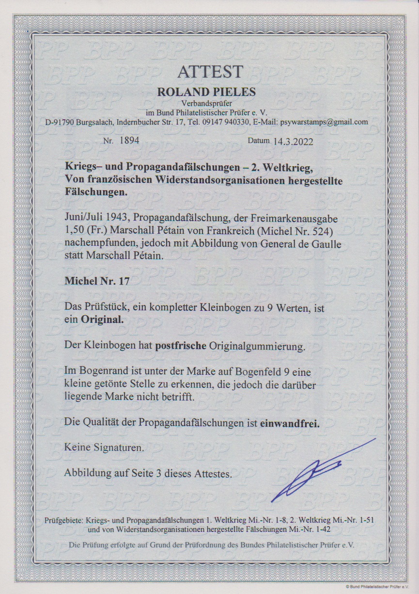 Fälschungen französischer Widerstands-Organisationen, 1,50 Fr. Petain im vollständigen postfrischen Kleinbogen, selten und im Michel mit 900,- nur in kursiv bewertet, Attest Pieles