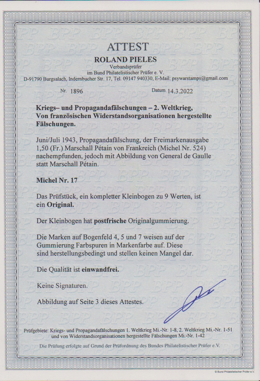 Fälschungen französischer Widerstandsorganisationen, 1,50 Fr. Petain im kpl. postfrischen Bogen. Attest Pieles. Mi. 900,- +