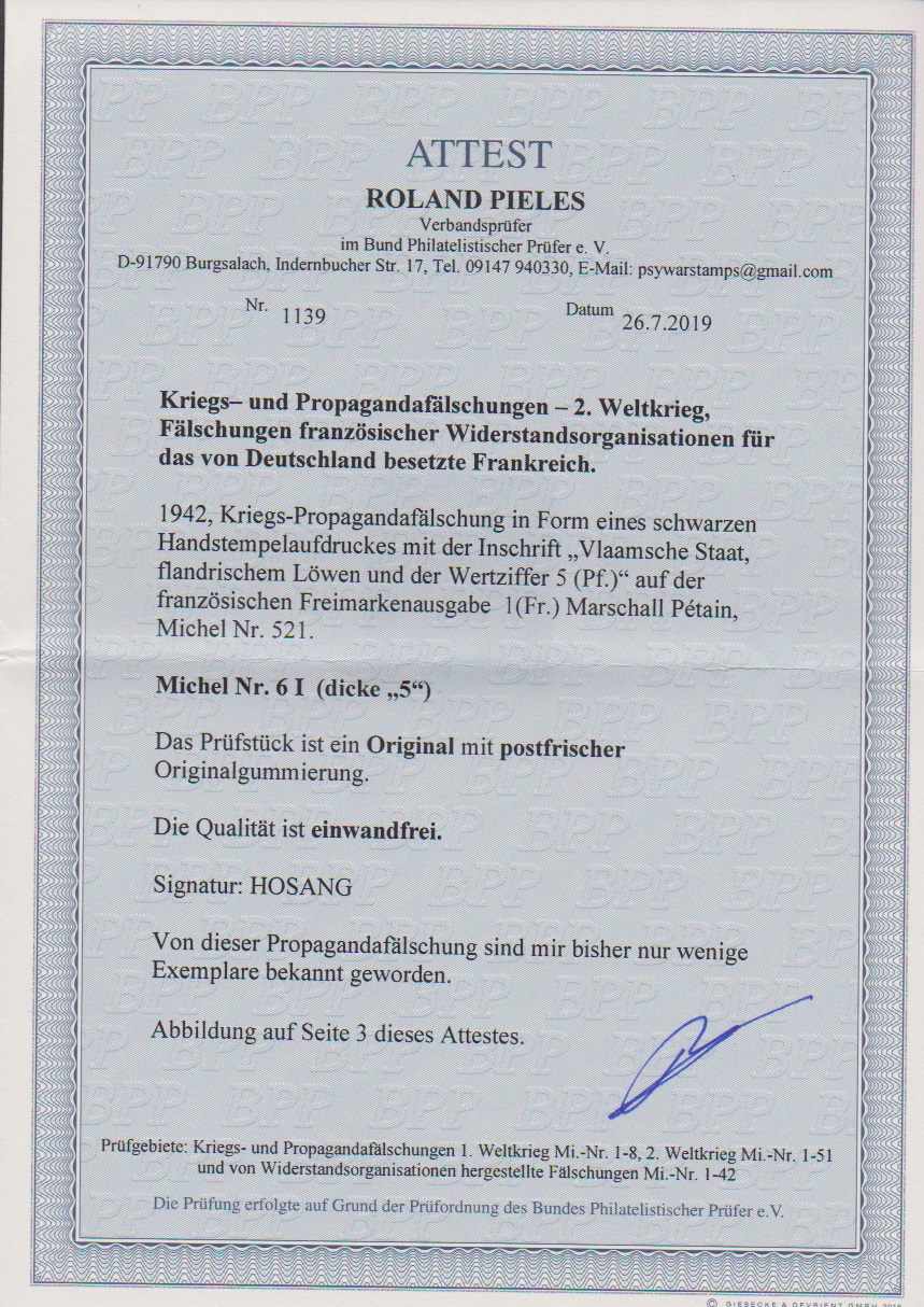 Fälschungen französischer Widerstandsorganisationen für das von Deutschland besetzte Frankreich, "5" Pfg. auf 1 Fr., "dicke 5", tadellos postfrisch, eine sehr seltene und nur in wenigen Exemplaren bekannte Marke. Sign. Hosang und Attest Pieles. Mi. "-.-"