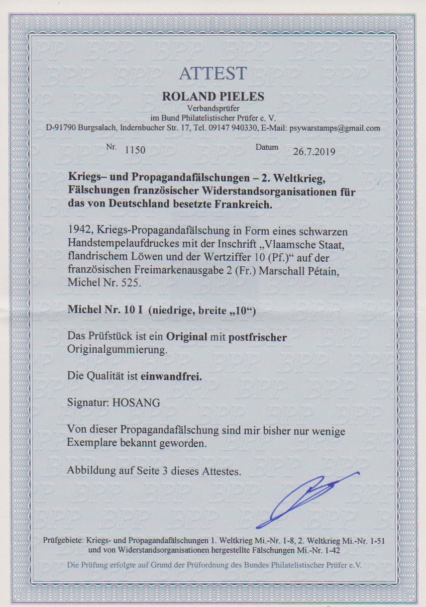 Fälschungen französischer Widerstandsorganisationen für das von Deutschland besetzte Frankreich, "10" Pfg. auf 2 Fr. Petain, "breite, niedrige 10" im Aufdruck, tadellos postfrisch vom Oberrand, eine nur in wenigen Exemplaren bekannte Marke. Sign. Hosang und Attest Pieles. Mi. "-.-"