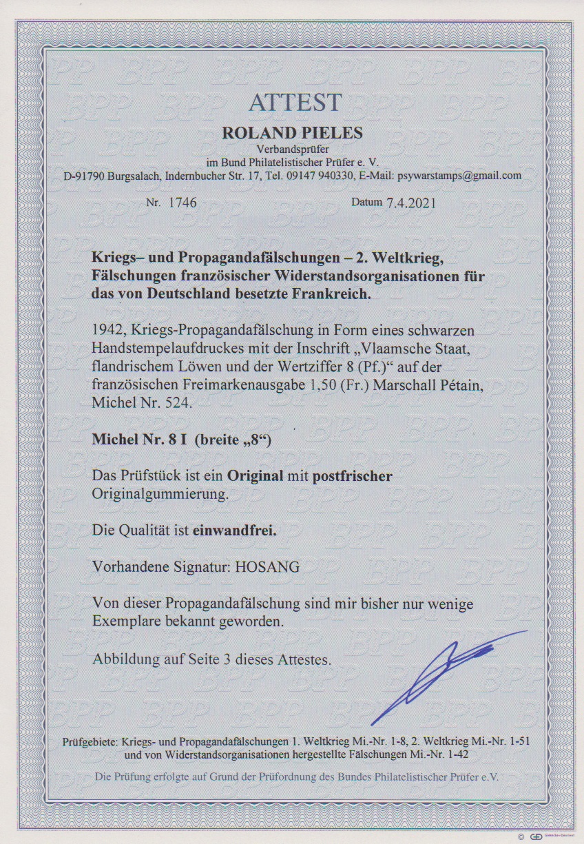 Fälschungen französischer Widerstandsorganisationen für das von Deutschland besetzte Frankreich, 8 Pfg. auf 1,50 Fr., Aufdruck in Type "breite 8" tadellos postfrisch. Eine ausserordentlich seltene Marke, von der nur wenige Exemplare bekannt geworden sind, wie auch das Attest Pieles bestätigt, ferner sign. Hosang. Mi. "-.-"