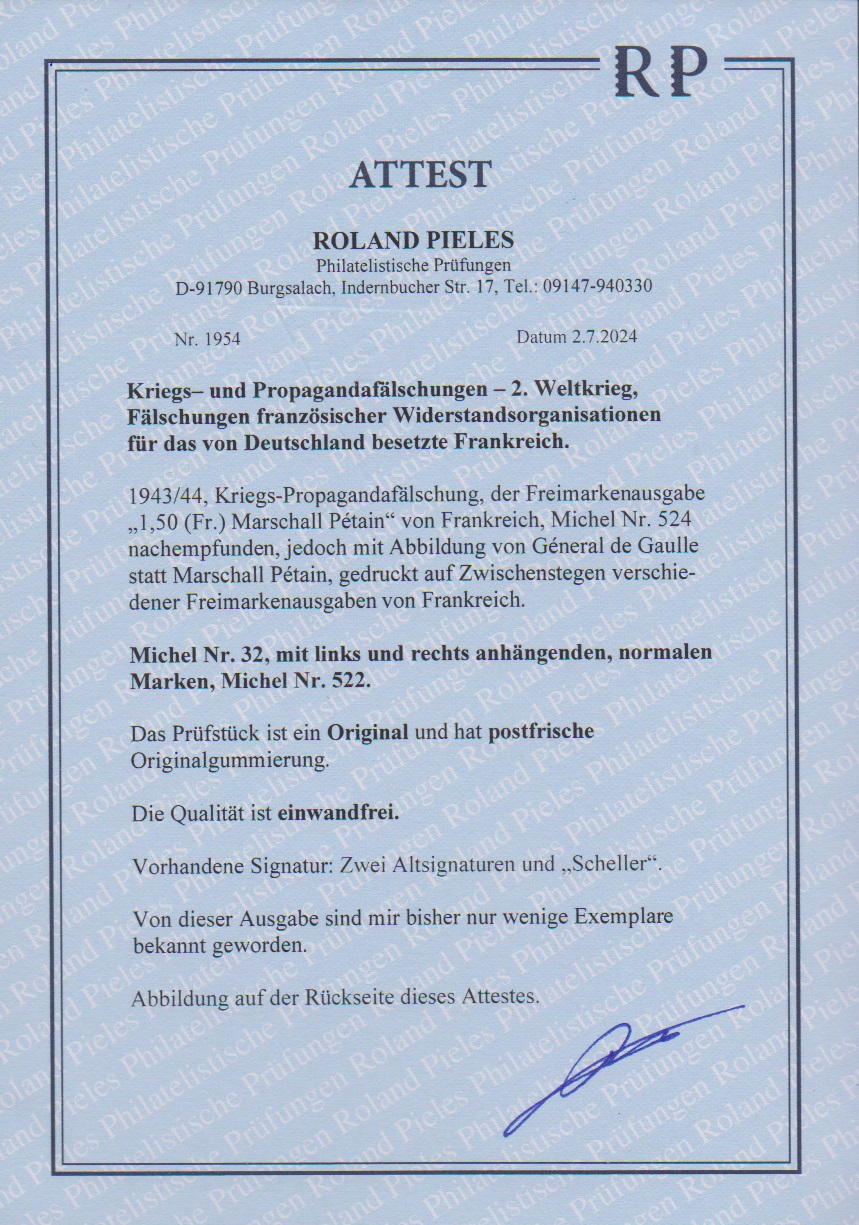 Fälschungen französischer Widerstandsorganisationen für das von Deutschland besetzte Frankreich, 1,20 Fr. Petain (Nr. 522), tadellos postfrisch. Attest Pieles "einwandfrei ... mir bisher nur wenige Exemplare bekannt geworden". Ferner sign. Scheller