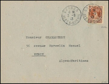 Fälschungen französischer Widerstandsorganisationen für das von Deutschland besetzte Frankreich, 1,50 Fr. Petain (mit den üblichen Gummispuren) auf sauberem Bedarfsbrief aus Cannes, 2.8.1943. Gelaufene Briefe dieser Marke sind selten und im Michel schon lose gestempelt nur mit "-.-" notiert. Sign. Scheller und Attest Pieles