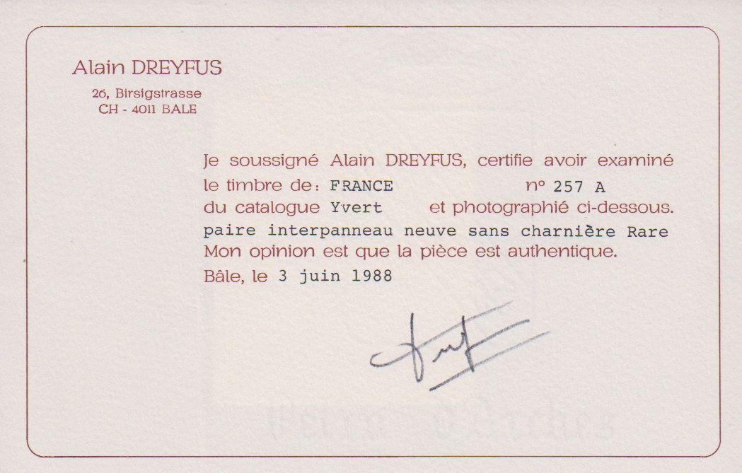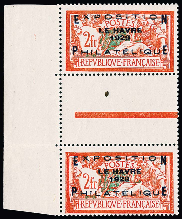 2 + 5 Fr. Ausstellung Le Havre im tadellos postfrischen, senkrechten Zwischenstegpaar (unten einmal in der Zähnung vorgefaltet). Als Zwischenstegpaar sehr selten, weder im Yvert noch im Michel mit Bewertung. Mi. der losen Einzelmarken 2000,- +, Attest Dreyfus