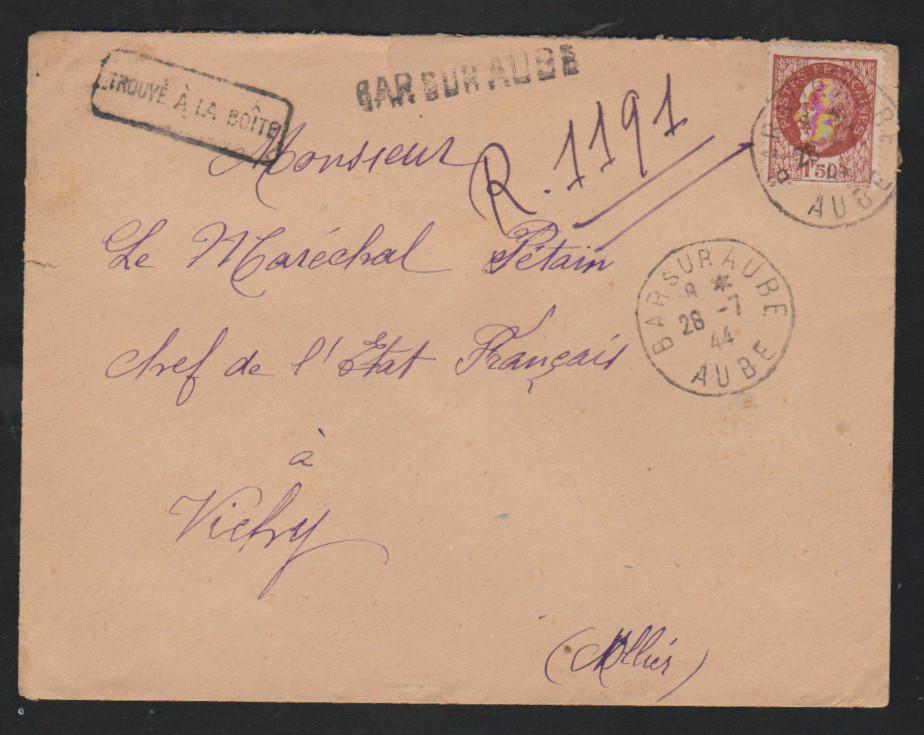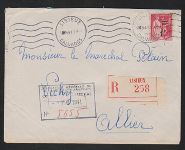 1 Fr. a. 1 Fr. 25 C. einzeln, sowie 1,50 und 3 Fr. Petain, 1941/43 auf zwei Einschreibebriefen, dazu weiterer Brief 1,50 Fr. (Neben-Ra1 "Trouvé à la Boite"), alle drei an den Marechal Petain in Vichy