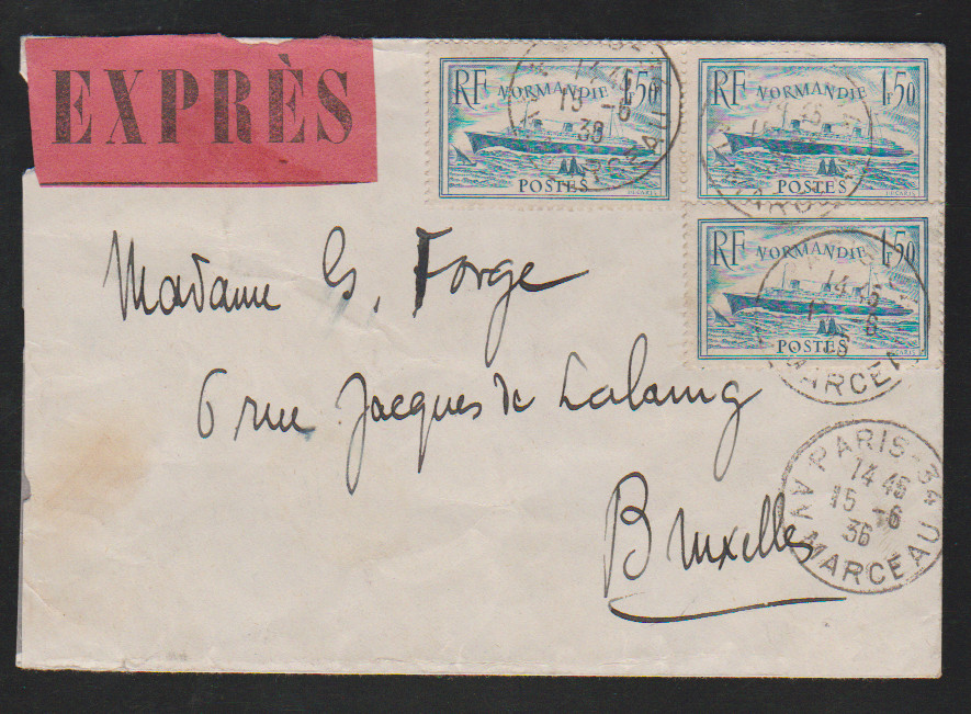 1,50 Fr. Normandie per drei als MeF auf Brief "Exprès" von Paris 1936 nach Brüssel, leichte Gebrauchsspuren