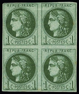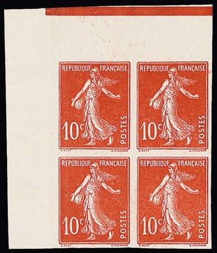 10 C. ziegelrot, Säerin, in der seltenen ungezähnten Variante im postfrischen (!) Viererblock aus der linken oberen Bogenecke, Frankreich-Rarität! Michel nicht gelistet