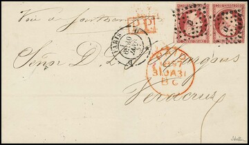 80 C. karmin, waagerechtes Paar, etwas berührt, auf Faltbrief der 2. Gewichtsstufe 1857 von Paris via Southampton nach Veracruz, Mexiko. Attest Scheller
