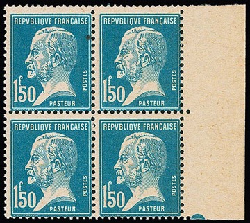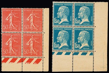 50 C. Säerin und 1,50 Fr. Pasteur, sog. "Marseille-Fälschungen" zum Schaden der Post in postfrischen Eckrand-Viererblöcken re. unten, Michel nicht gelistet, Attest Pieles