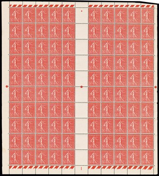 50 C. Säerin und 1,50 Fr. Pasteur, sog. "Marseille-Fälschung" zum Schaden der Post im vollständigen postfrischen Bogen zu 100 Werten mit Zwischenstegen, bei der Nr. 161 fünf Werte Bugspur. Als vollständige Bögen dieser im Michel nicht gelisteten Postfälschung von größter Seltenheit. Sign. Calves, Jaquard und Atteste Pieles