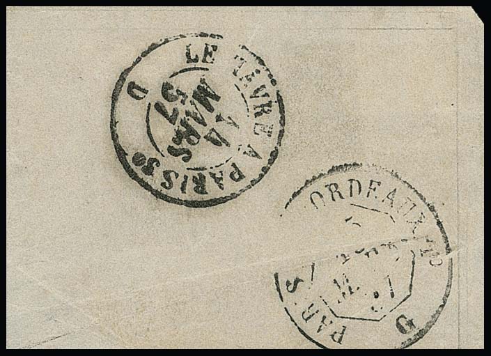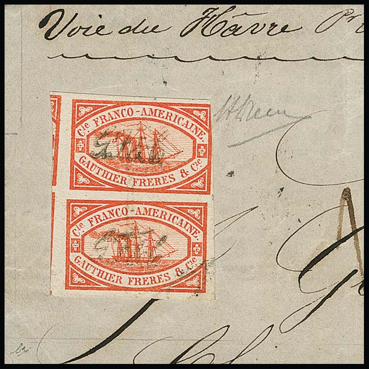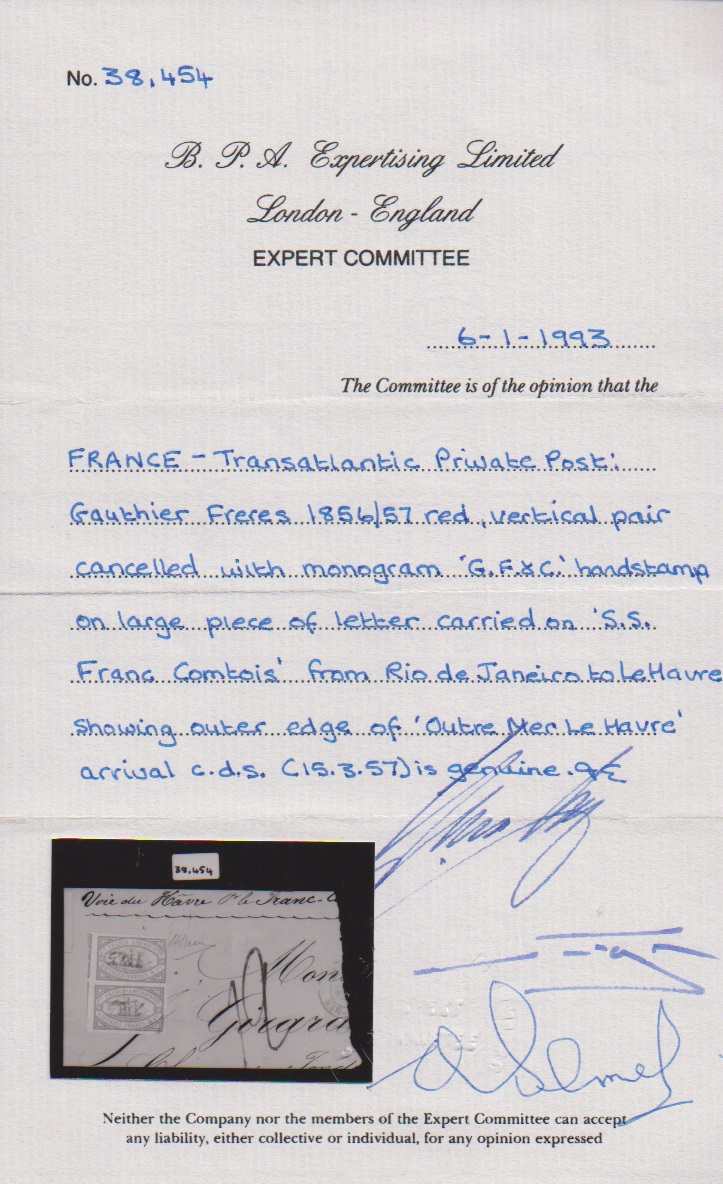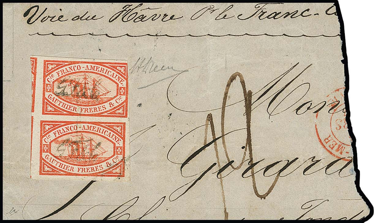 Transatlantik-Schiffspost Gauthier & Freres, 1855/56, die rote Marke für die Linien von Le Havre nach New York und Rio de Janeiro im senkrechten Paar auf großem Briefteil mit Schreibschrift-L1 "G.F.& C." (von Gauthier & Freres). Obere Marke oben rechts kurz berührt, sonst überrandig und gut. Es handelt sich um die seltensten Schiffspostmarken der Klassik weltweit. Während es von der berühmten "Lady Mc Leod" sicher mehr als 50 Exemplare gibt, sind von den Gauthier-Marken lediglich zwei Exemplare der blauen Marke (wahrscheinlich für Post nach Europa, diese u.a. auf einem Portugal-Brief registriert) und acht Exemplare der vorliegenden roten Marke (wahrscheinlich für Post nach ausserhalb Europas) bekannt, davon ist das vorliegende das einzige Paar, dieses bereits ausführlich beschrieben als Weltseltenheit im berühmten Buch "Seltene Briefmarken" von L.N. und M. Williams. Attest BPA, sign. Diena. Provenienz: Ritchie Bodily (1961), Slg. D. Kelly, Slg. Steindler (Robson Lowe 1972, Titelfoto, Käufer für 6500,- SFr. + Aufg. war R. Mondolfo), Slg. "Mayflower" (D. Feldman, Zürich, 1983), Robson Lowe 1992 (Titelfoto), D. Feldman 1993 (Zuschlag 16.000,- SFr. + Aufg.)