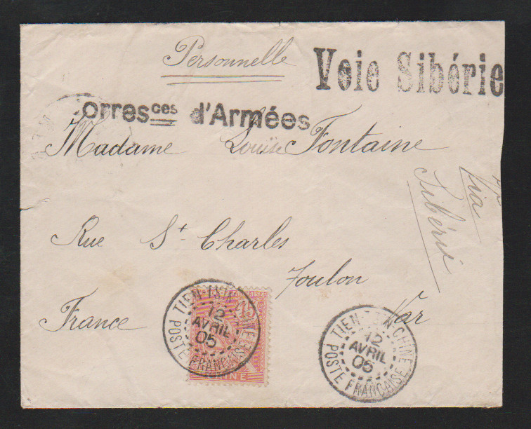 Französ. Post in China, 15 C. einzeln auf Brief aus "Tientsin" 1905 nach Toulon, Neben-L1 "Corres ces d`Armees"
