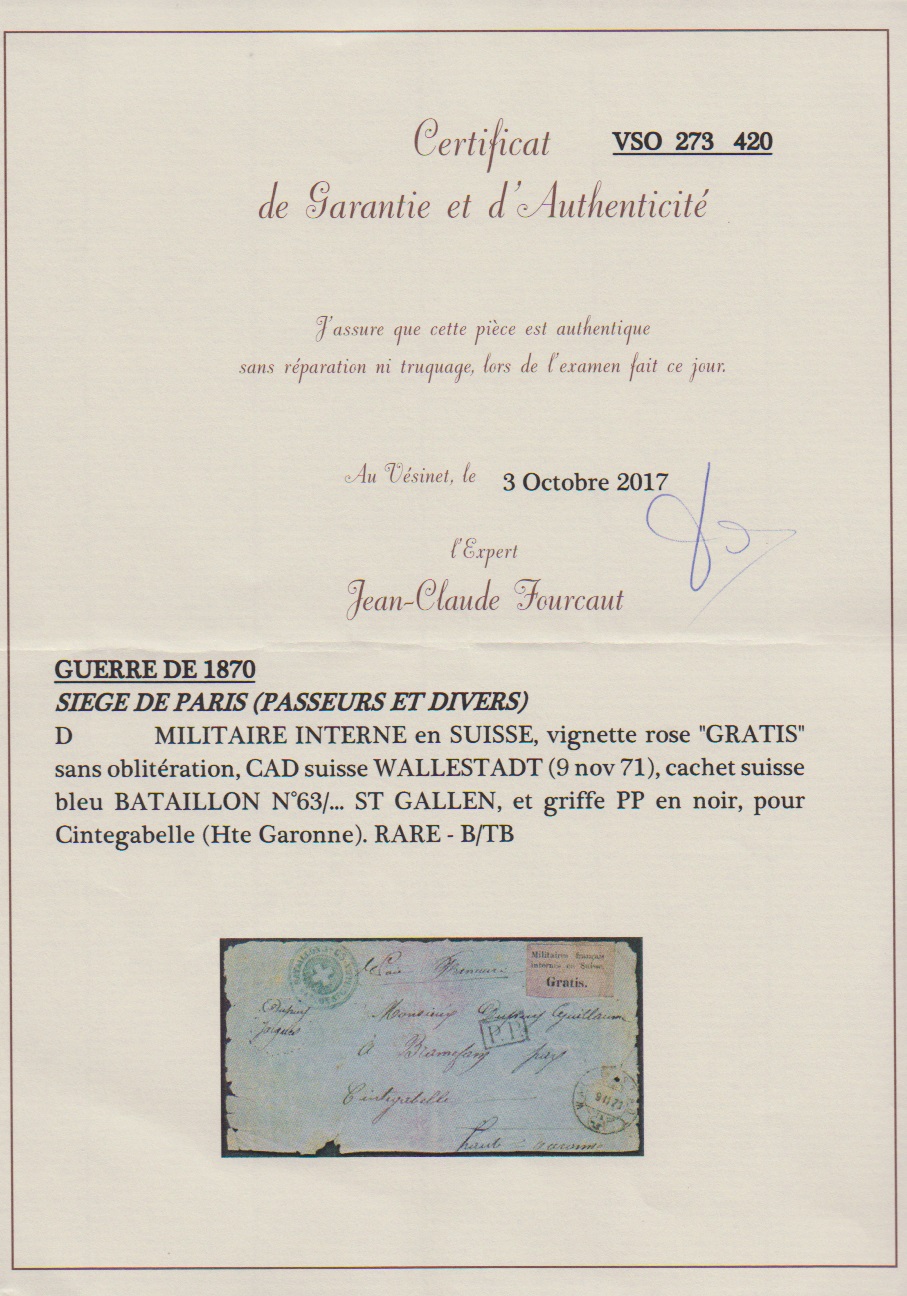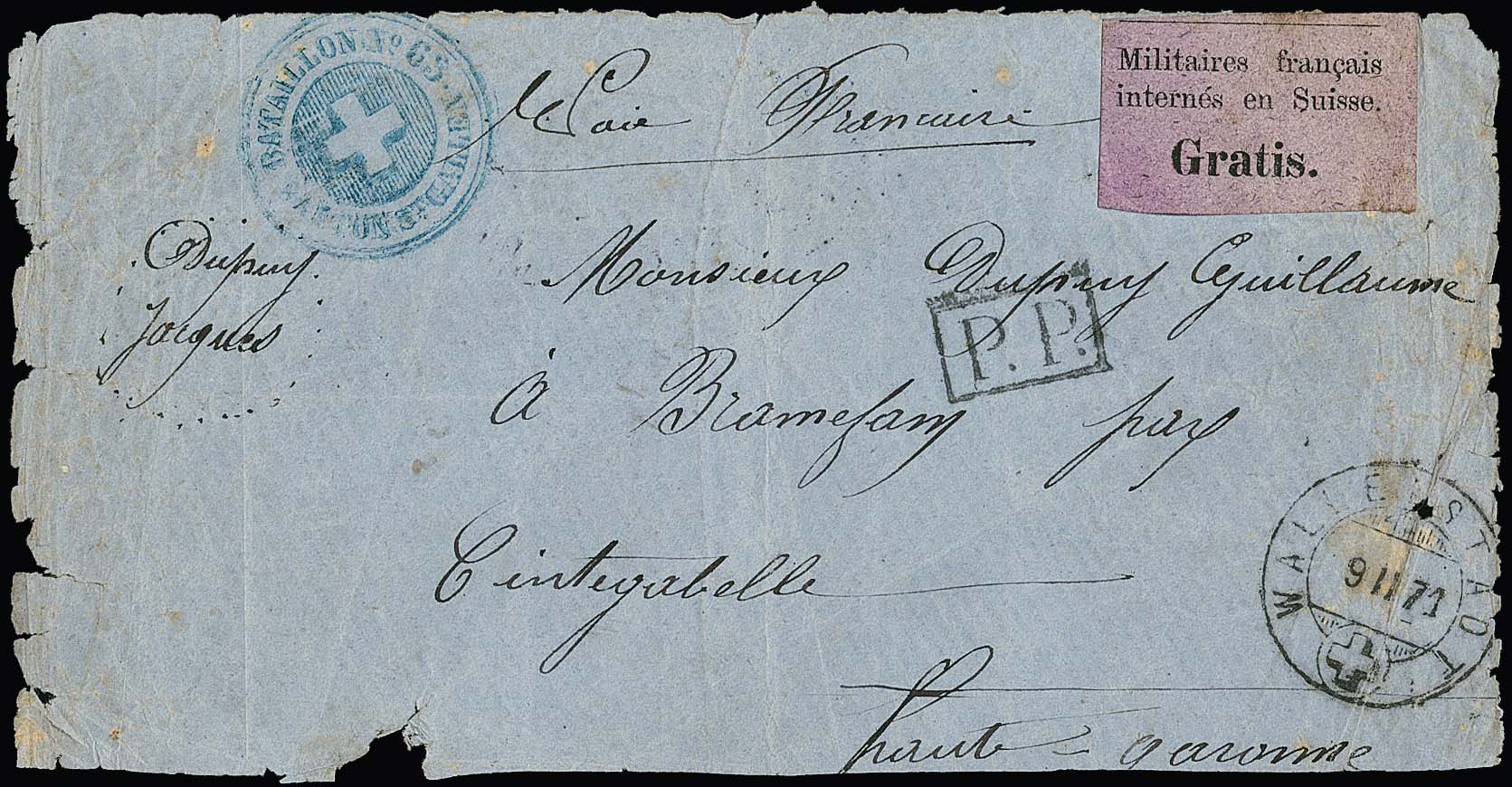 1871, Schweizer Portofreiheits-Vignette für internierte französische Militär-Angehörige, "Gratis" auf graulila, einzeln auf (etwas fehlerhafter) Briefvs. von Wallerstadt (zusätzlich blauer Kreuz-Stempel) nach Cintegabelle. Attest Fourcaut