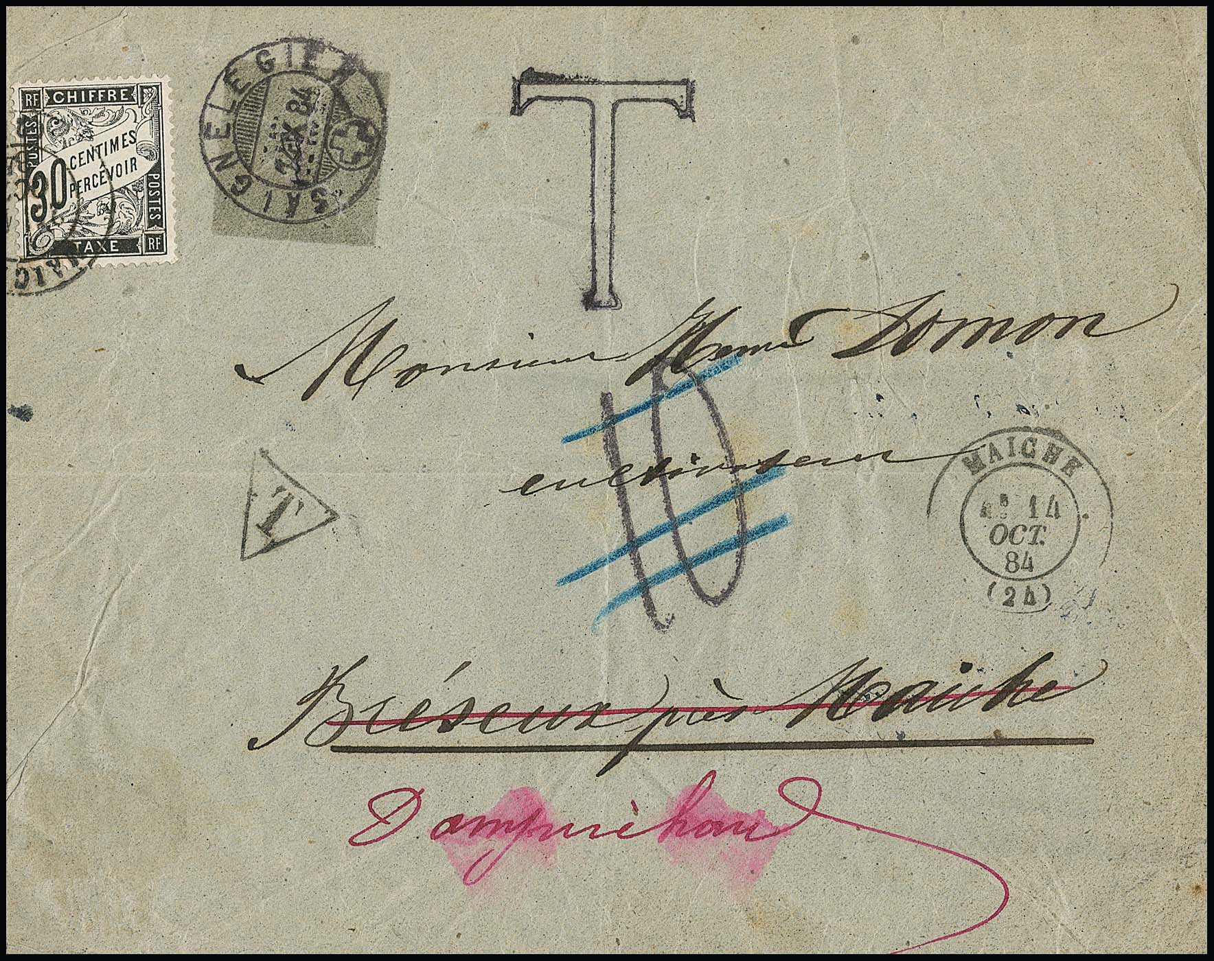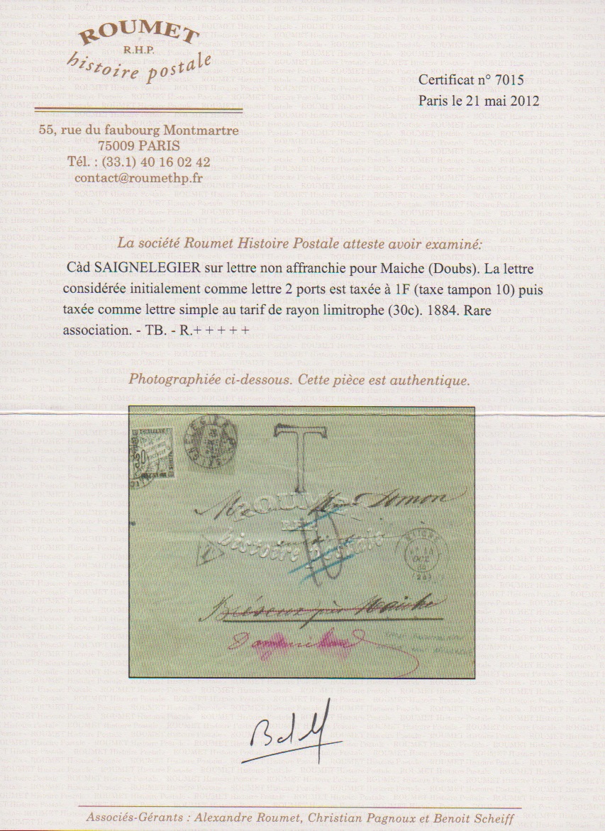 1884, Portomarke 30 C. auf Couvert aus Saignelegier/Schweiz nach Maiche, von dort mit K2 weitergesandt nach Champrichard, Taxstempel "10" gestrichen, seltener Nachsendebrief innerhalb eines Grenzrayons (Kaufpreis 2013 726,- Euro), Attest Roumet
