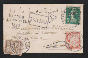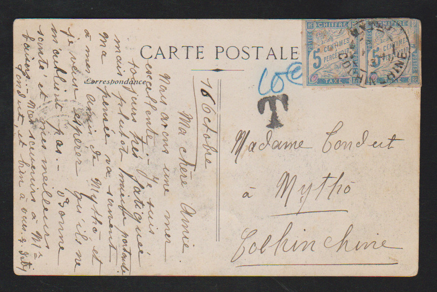 Französische Post im Ausland, 1913, Ansichtskarte aus Ceylon mit 3 C. grün, Edward, bildseitig, nach Cochinchina, dort Paar Portomarken 5 C. blau (fran. Post im Ausland, etwas "eckrund") nachfrankiert