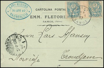 Französische Post in der Levante, 1907, 5 C. grün im sehr seltenen Zwischenstegpaar auf Postkarte (Formular links kl. Randkerbe) aus Vathy/Samos nach Trondheim/Norwegen. Sehr seltene Kombination von Zwischenstegpaar mit gänzlich ungewöhnlicher Destination!