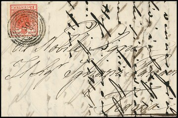 15 C. rosa, Handpapier, auf Prachtbrief (siehe Foto) mit seltenem Vierringstempel "Ponte di Valtellina" (ähnlicher Brief Dr. Jerger = 900,- SFr. Zuschlag)