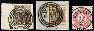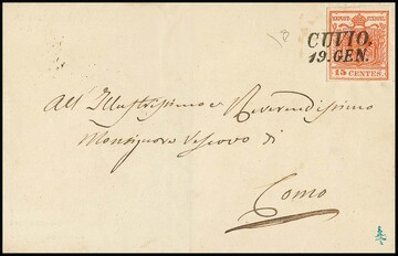 15 C. rosa, noch voll- bis breitrandig, auf Prachtbrief mit seltenem L2 "Cuvio", Attest Diena, ex Provera, ähnlicher Brief Dr. Jerger = 1000,- SFr. Zuschlag