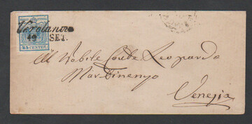 15 C. rosa, Handpapier, breitrandiges Kabinettstück auf Brief mit stummem Dreiringstempel "V." von Venezia, L2 "Venezia" nebengesetzt, Brief mit Inhalt 1851, nach Campo Croce, ähnlicher Brief ex Jerger = 1400,- SFr. Zuschlag