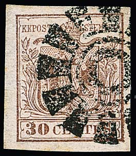 30 C. braun, Handpapier, Kabinettstück mit besserer Entwertung durch stummen Mühlradstempel