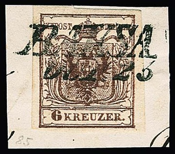 "Triest", seltener kleiner Ra1 "V. Triest" vollständig auf Kabinettbriefstück 6 Kr. braun