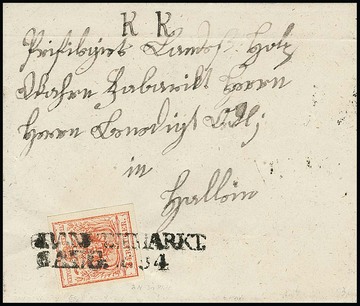 "Frankenmarkt", sehr seltener L2 klar auf Kabinettbrief 3 Kr. rosa, Handpapier, Brief mit Inhalt 1854, Zuschlag für ähnlichen Brief ex Dr. Jerger = 1400,- SFr.