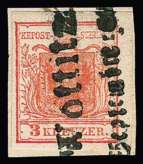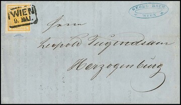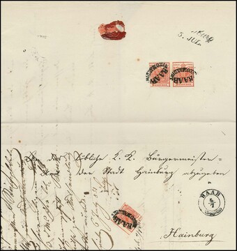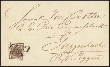 "Raab Recommandirt", der seltene Ovalstempel klar als Markenentwertung, K2 nebengesetzt, auf Brief mit Einzelmarke 3 Kr. rosa vs. und Paar 3 Kr. rs. (angeschnitten), auf Brief sehr seltener Stempel (vgl. Rohlfs = Zuschlag 2000,- Euro), Brief mit Inhalt 1851