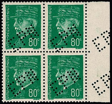 Nancy (Meurthe et Moselle), 23.7.1942, 80 C. Petain mit Lochung "EPN", herausgegeben anläßlich der Briefmarken-Ausstellung, im postfrischen Viererblock vom Rand, Attest Pieles (2022)