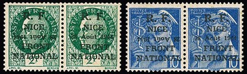 Nizza, 1944, komplette postfrische Serie Merkur und Petain je mit lokalem Aufdruck anläßlich der Befreiung, jeweils im Paar, dabei die linke Marke einheitlich mit kopfstehender Datumszeile "28 Août 1944". Attest Pieles "In der vorliegenden Form, als Paare mit und ohne Aufdruckfehler, sind diese Ausgaben selten"
