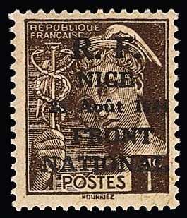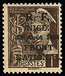 Nizza, 1944, 1 C. Merkur mit lokalem Aufdruck der Front Nationale anläßlich der Befreiung, die seltene unverausgabte Marke mit einer Gesamtauflage von nur 100 Ex. tadellos postfrisch, sign. Calves und Attest Pieles