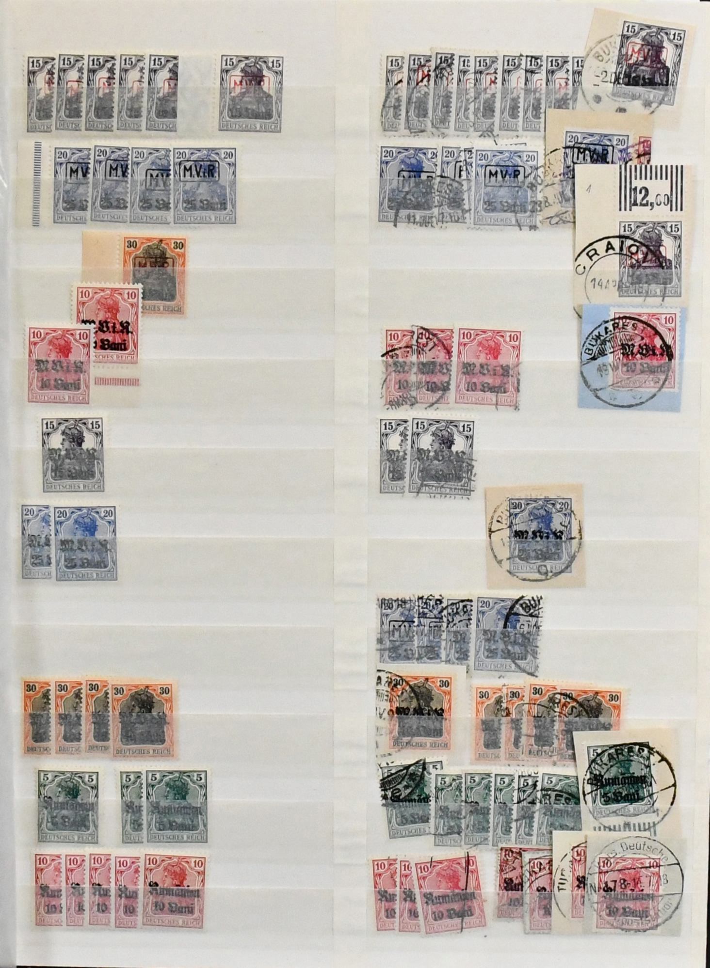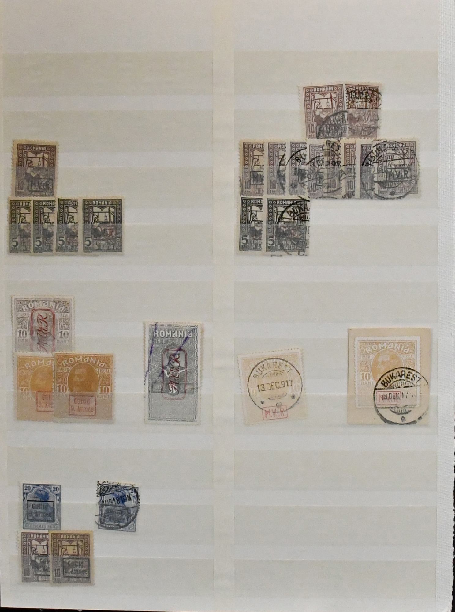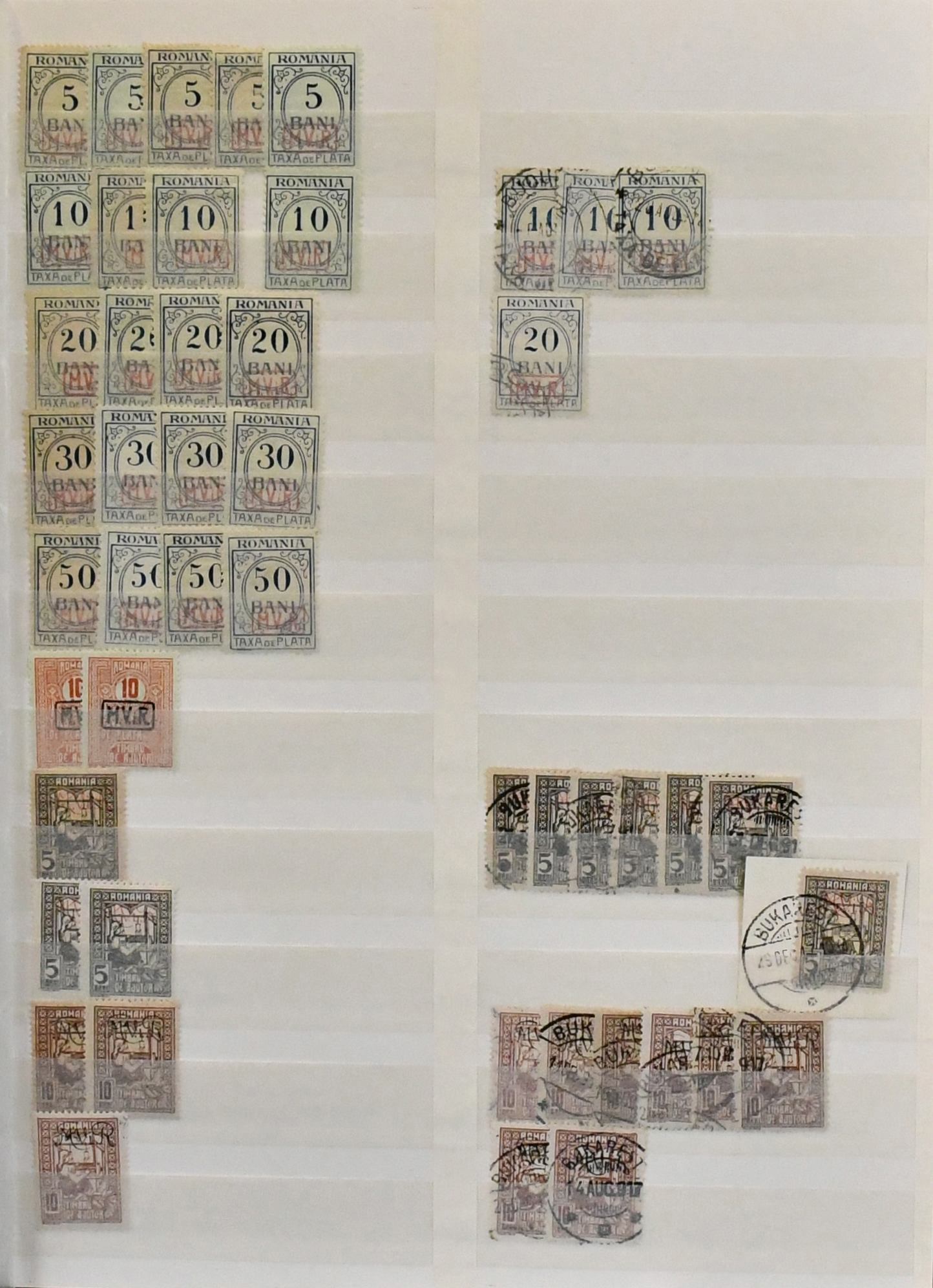 Rumänien, sauber gest. Slg. ab Nr. 1/3, auf KABE-Vordrucken. Dabei Porto Nr. 1/5 u. 8 (Mi. 120,-), Zwangszuschlag Nr. 1/7x/y (Mi. 324,-), sowie 9. Armee Nr. 1/4 (Mi. 180,-)