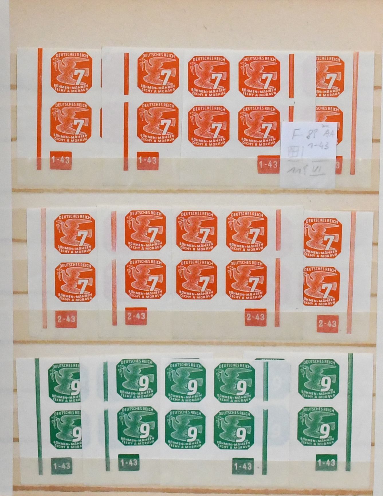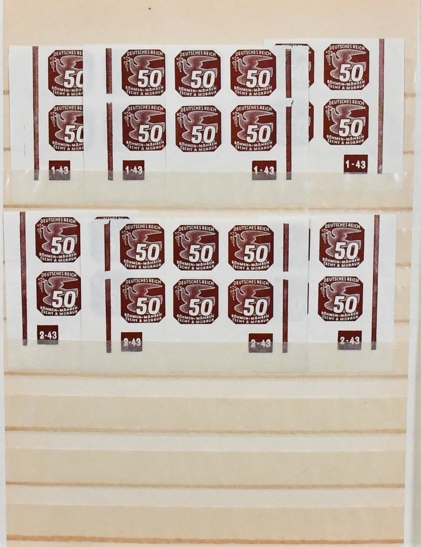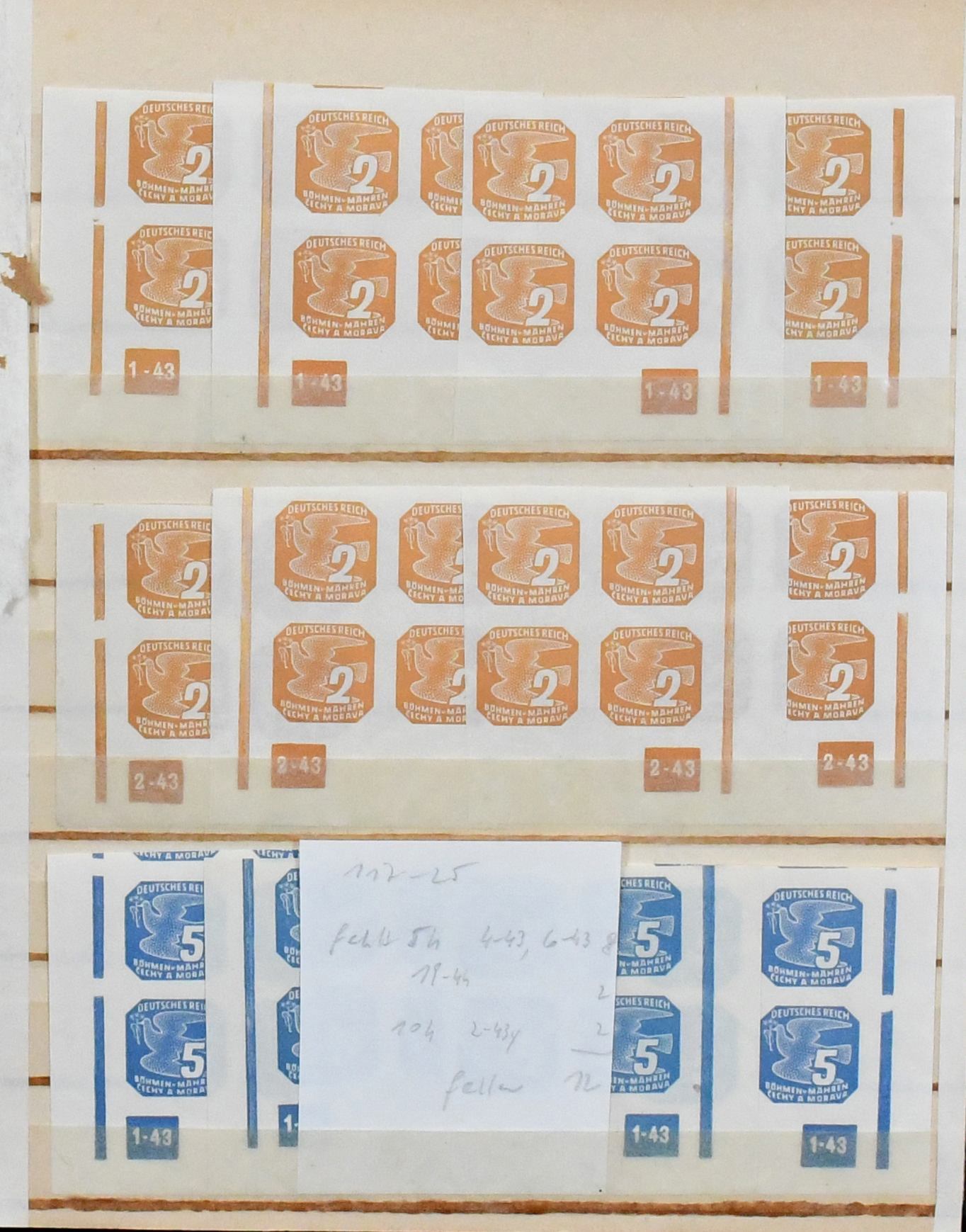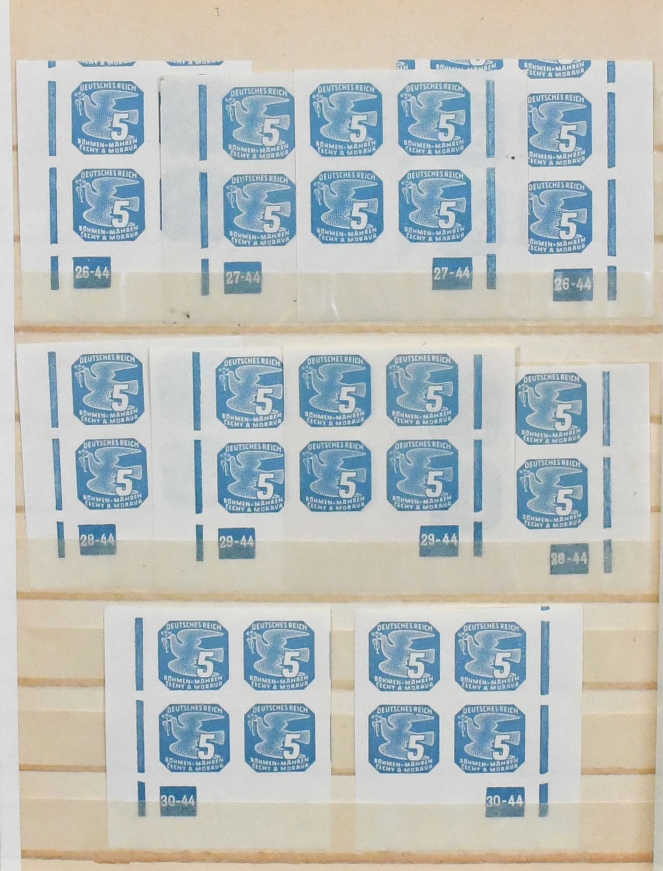 Böhmen und Mähren, Mi.-Nr. 117-125, postfrischer Bestand Viererblöcke, alle mit Pl.-Nr., jede Wertstufe mehrfach vertreten, dabei auch die besseren wie z.B. Nr. 118 Pl.-Nr. 18-43 bzw. ex 19-44 bis 30-44