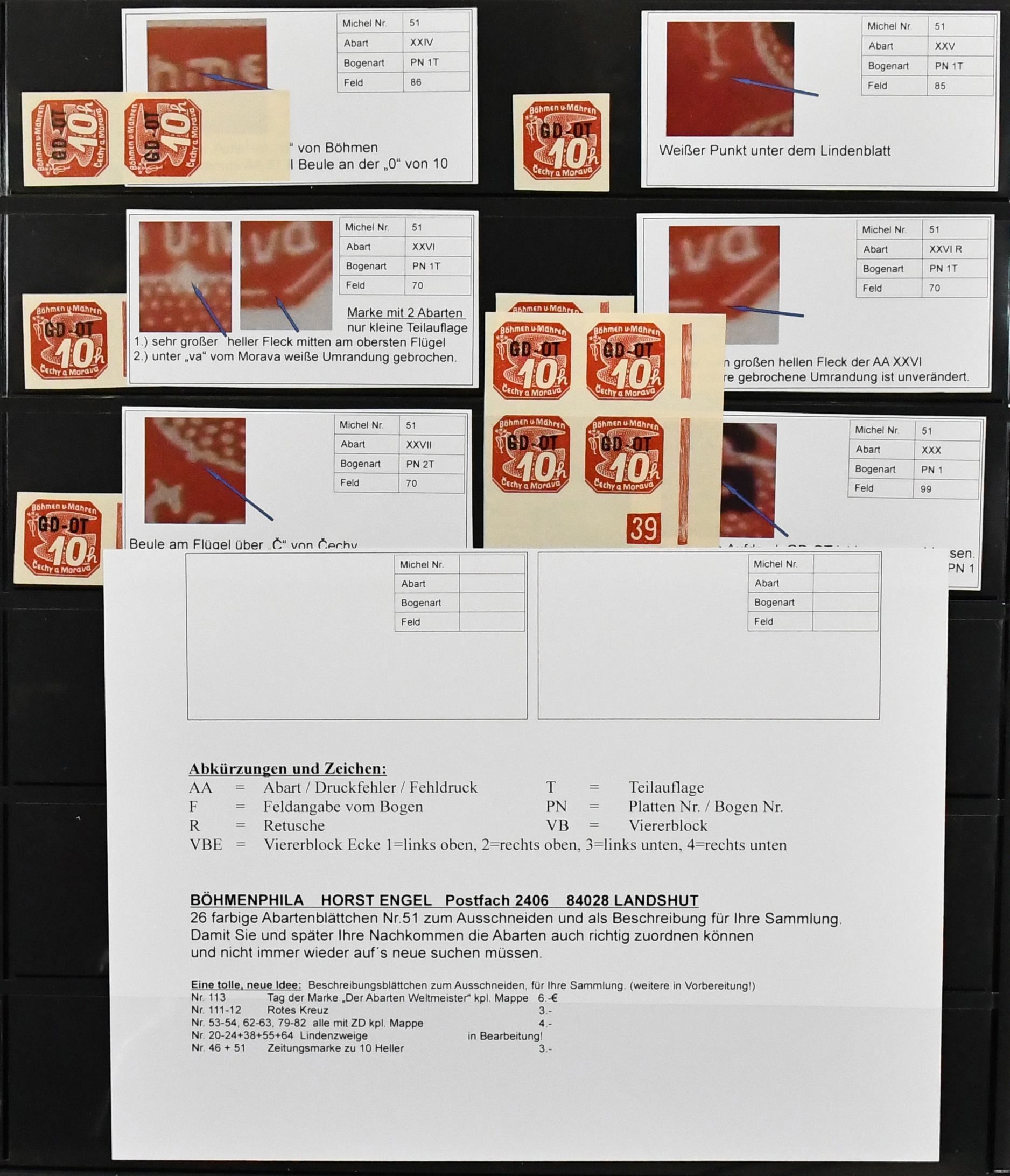 Böhmen und Mähren, postfrische Plattenfehler-Partie der Nr. 51-54 mit genauer Feldbestimmung