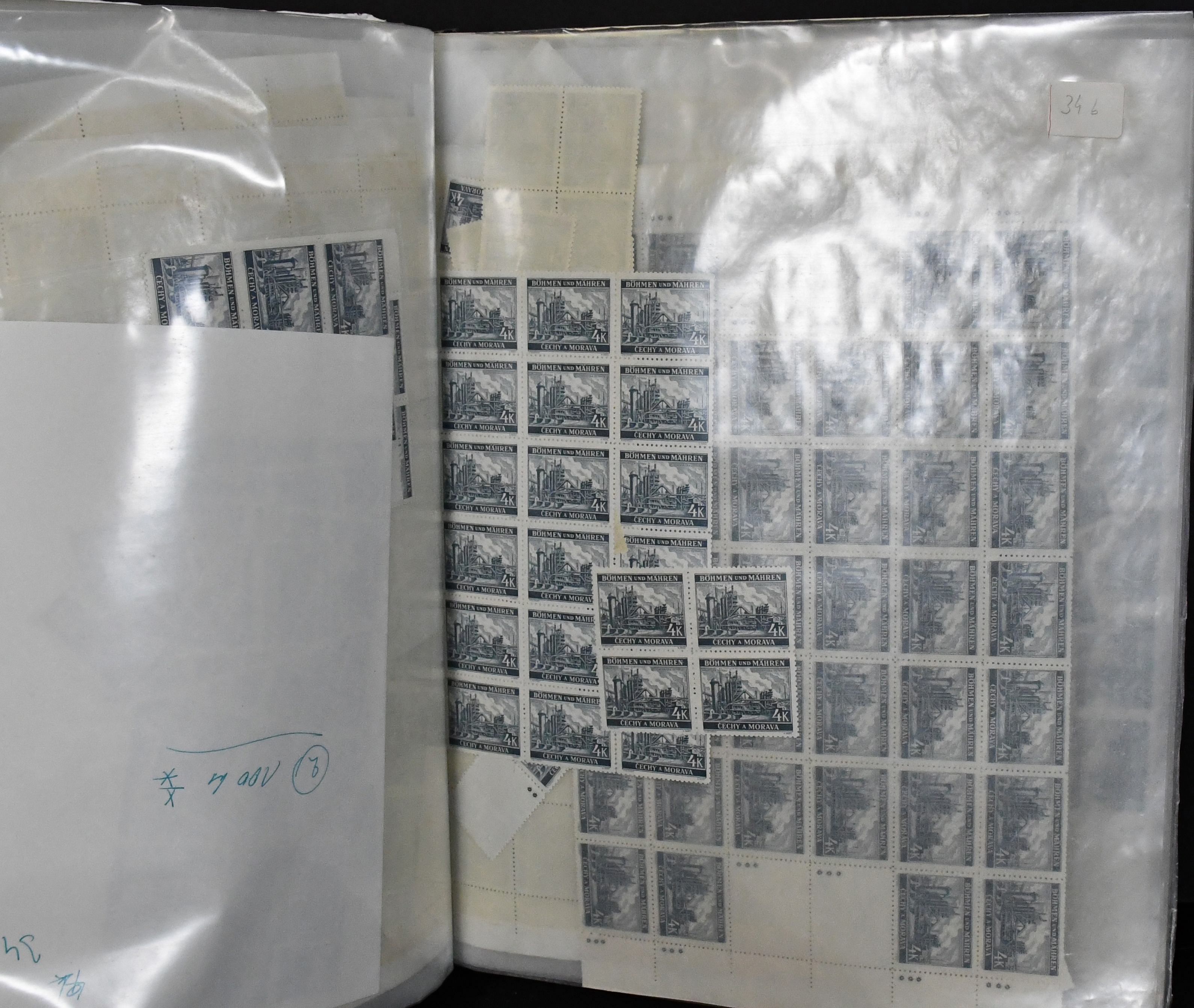 Böhmen und Mähren, dickes Lagerbuch mit vielen hundert postfrischen Eckrand-Viererblöcken ab Nr. 111 (inkl. Porto), zustäzlich einige gest. VB, dabei Plattenfehler und Leerfelder