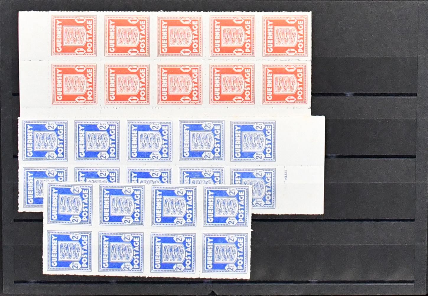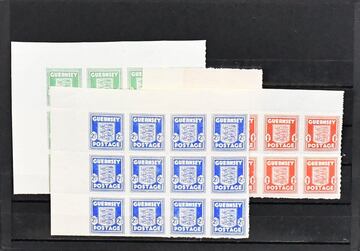 Guernsey (Kanalinseln, Bes. II. Wk.), Nr. 1-3 mindestens 32mal postfrisch, oft in Eckeinheiten, Mi. 1650,-