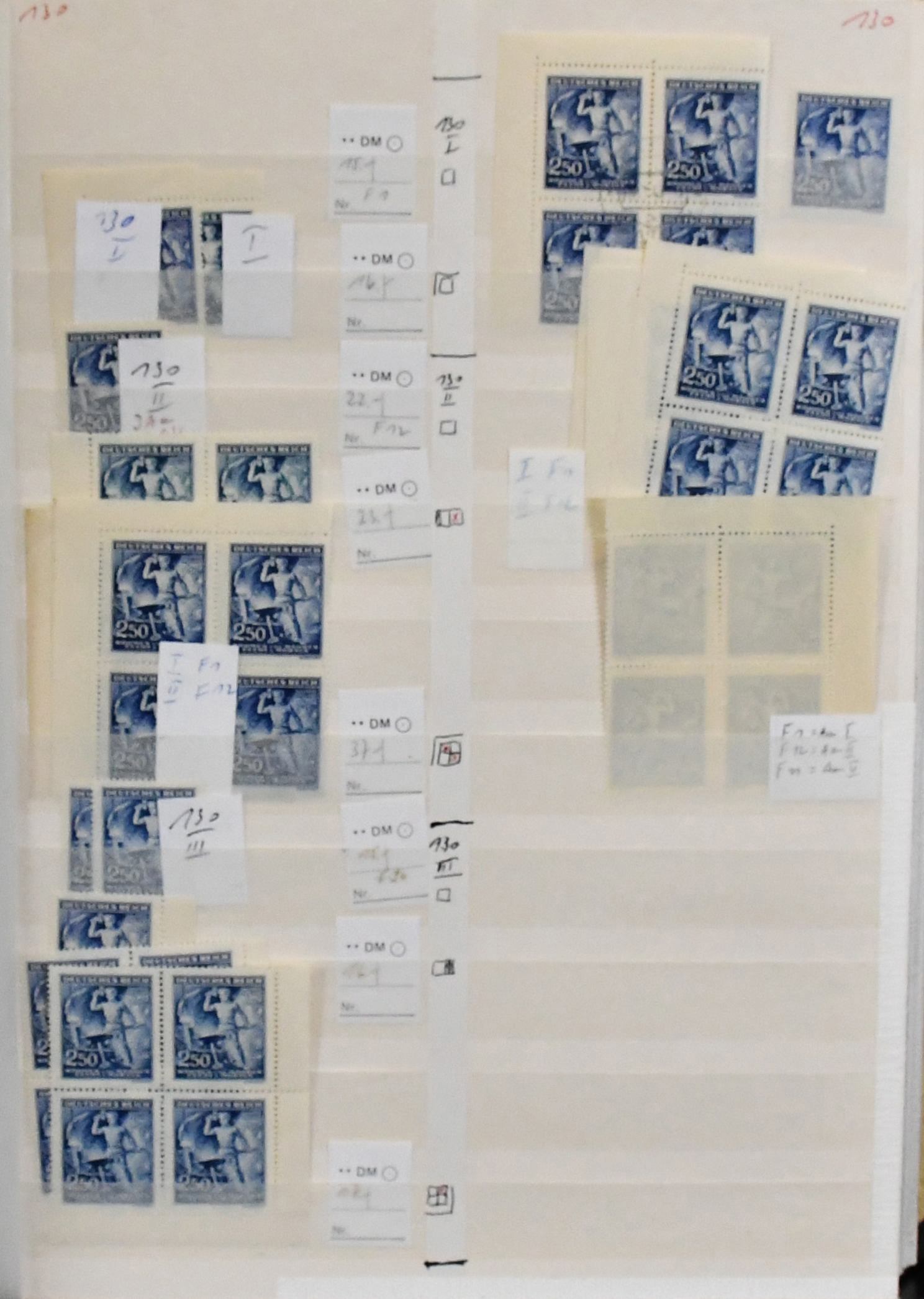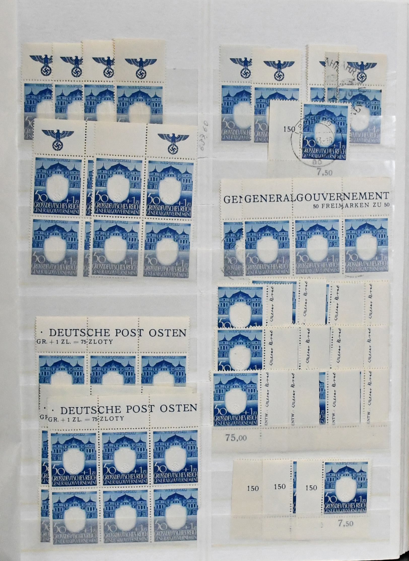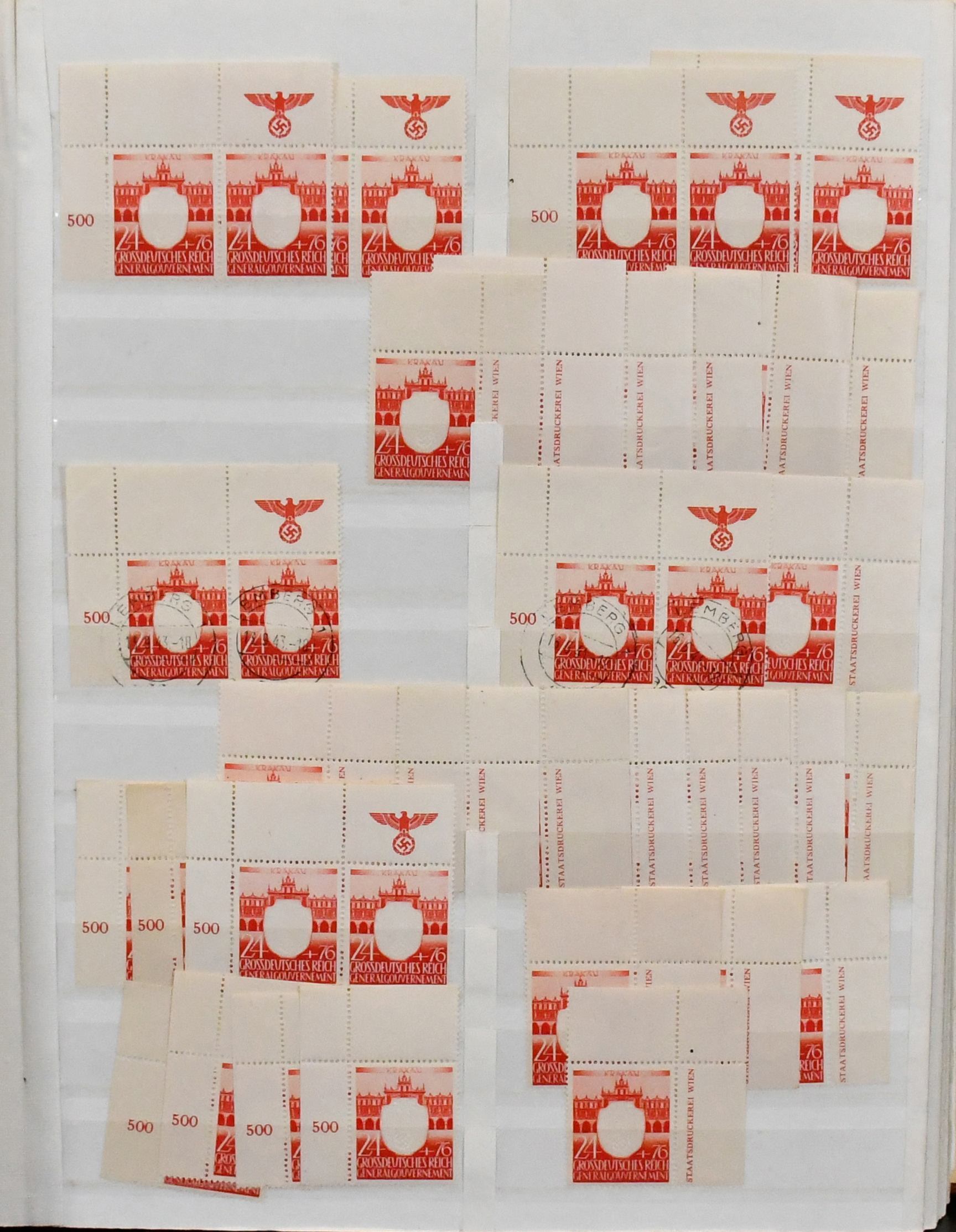 Generalgouvernement, nur der drucktechnisch anspruchsvolle Prägedruck-Satz Nr. 105-109, dickes Lagerbuch mit einer Vielzahl von Marken, u.a. postfrische Einzelmarken und Eckrand-Viererblöcke je aus der Bogenecke mit Randinschriften in Mengen, Entwerferzeichen, Druckvermerken, Reihenzählern usw. In dieser Menge ein seltenes Angebot (wir schätzen ca. 250 kpl. Serien, davon sehr viele als Eckrand-Einheiten!)