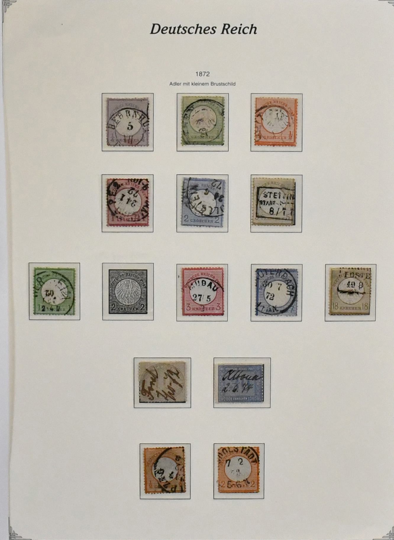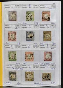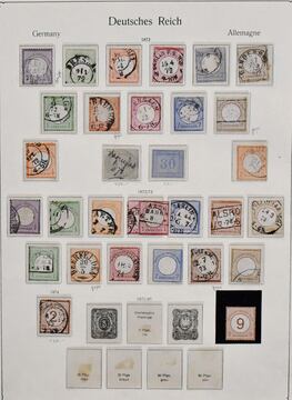 Deutsches Reich, 1872-1874, gestempelte Slg. mit Nr. 1-6, 11, 12/13 mit Federzug, 16-23 usw., auf Vordrucken. Mi. 3000,-