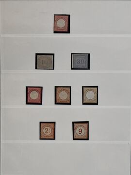 Deutsches Reich, von Nr. 1-30 komplette Sammlung der Brustschild-Ausgaben auf Vordr., dabei Nr. 1/11 gest., Nr. 8 tiefst gepr. Sommer, Nr. 11 tiefst gepr. Pfenninger, Nr. 12 mit Federzug, 13 ungebr., 14/15 gest., 24 mit dekorativem Taxis-K1 "Beerfelden", hoch gepr. Sommer BPP, Nr. 27b, gepr. Sommer, 30 ungebr. etc. Mi. 6700,-, dazu eine Nr. 28 mit Eckstempel unberechnet