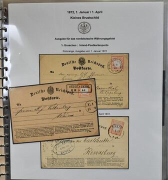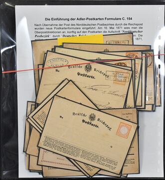 Brustschilde, "Postkarten-Formulare", Spezialslg. nach Frech mit 40 frankierten Postkarten-Formularen (Nr. meist hs. nach Frech), sowie vier mit Marken vorfrankierten, aber nicht gelaufenen Karten (u.a. Nr. 7 auf Karten-Formular Nr. 1). Dazu zwei unfrank. Karten, seltenes Angebot!