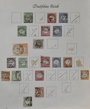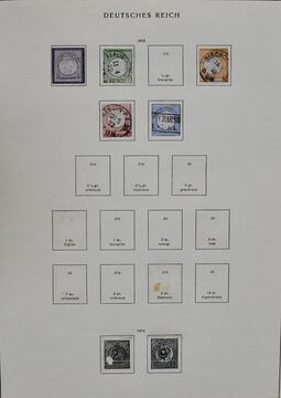 Deutsches Reich, 1872/1923, gestempelte Sammlung, beginnend mit einigen Brustschilden ab Nr. 2/3, mit Nr. 7, 10, 12 mit Federzug, 16/21, 37 in versch. Farben, 65, Infla in der "Breite" reichhaltig, ohne ungeprüfte teure Werte, sowie Dienst ab Nr. 1/8, im alten Borek-Vordruckalbum. Mi. 3400,-