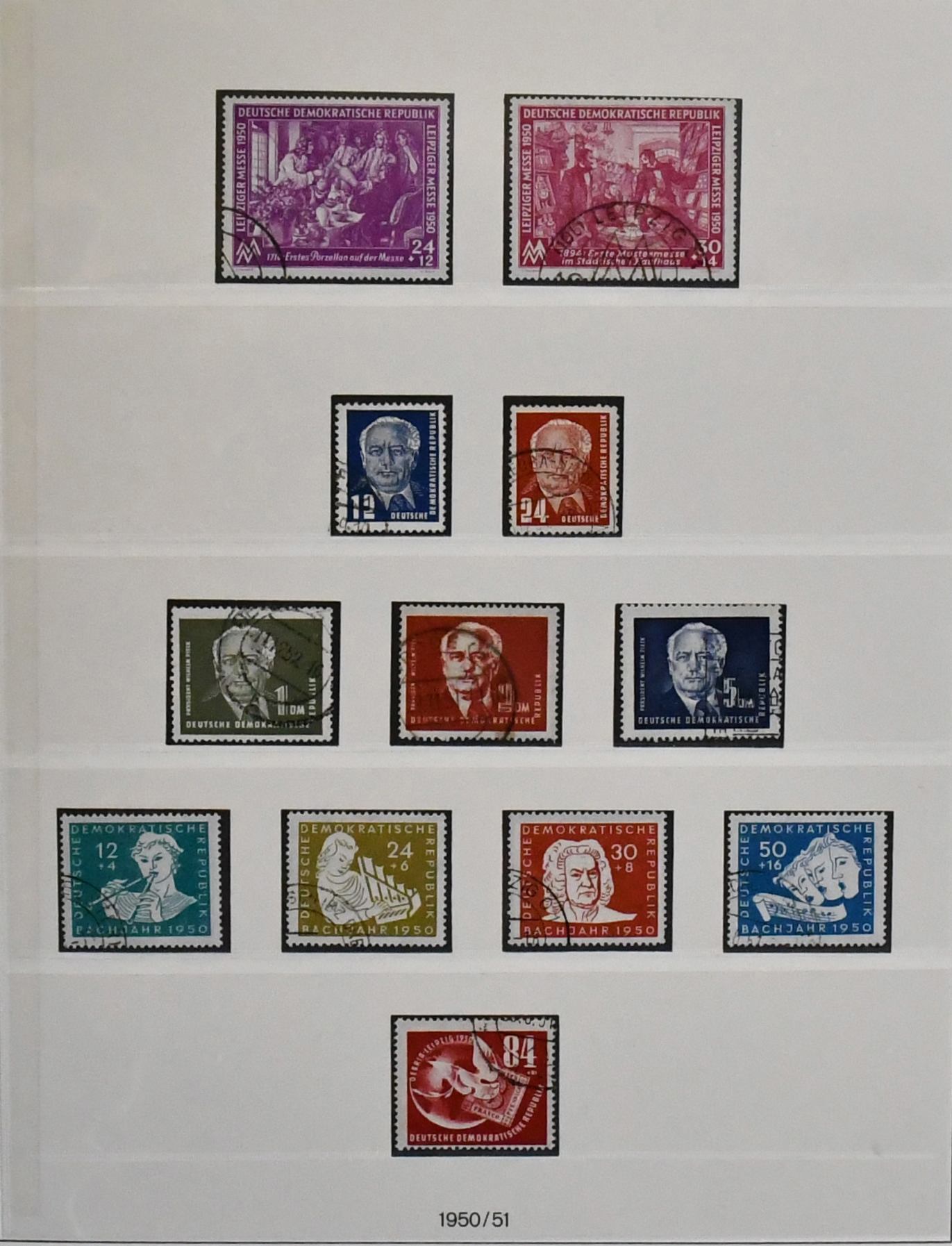 DDR, 1949-1990, dreibändige, meist postfrische Slg., annähernd kpl. (einige wenige Werte fehlen bzw. sind ungebraucht), dabei Messe-Ausgaben, Bach, Chinesen (Nr. 286/88), Bl. 7, Marx-Blöcke (8/9A/B), teils geprüft, Bl. 10/15 usw. Mi. 4800,-