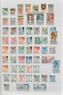 Französische Zone, 1945/49, fast nur postfrische Zusammenstellung von etwa 450 Werten aller drei Gebiete, dabei u.a. Baden Nr. 28/41A (Mi. 270,-), Bl. 1A, Nr. 46/57 (160,-), Württemberg Nr. 37/39, 44/50 usw.