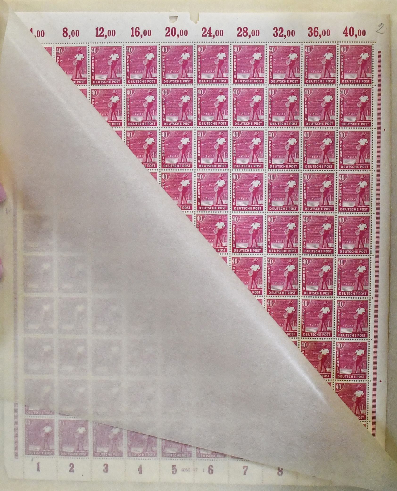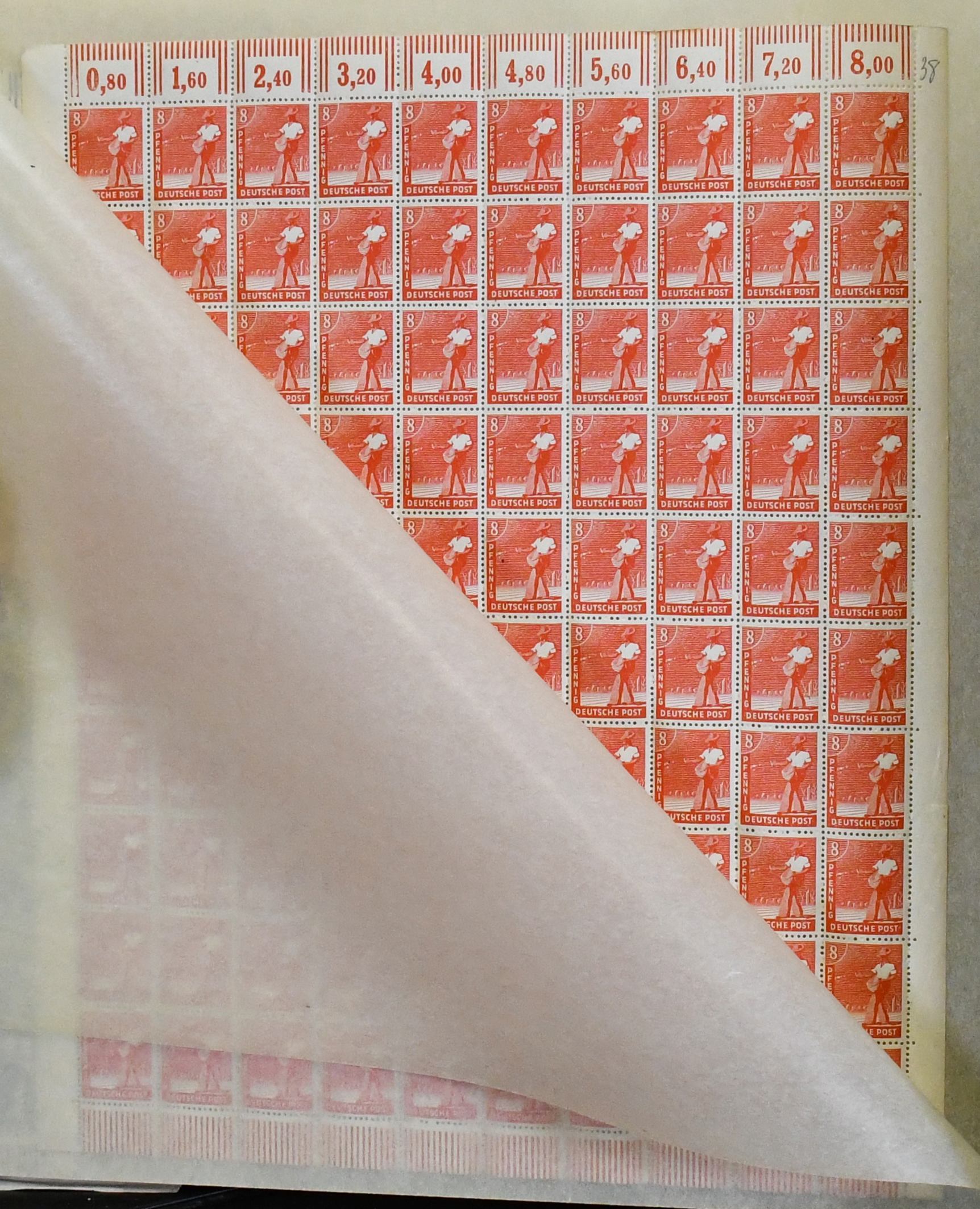 Gemeinschaftsausgabe, Arbeiter-Ausgabe, sieben postfr. Randstücke je mit Druckerzeichen inkl. Nr. 949. Dazu sechs Bogenecken der Mark-Werte (Falz im Oberrand) je mit Plattennummer