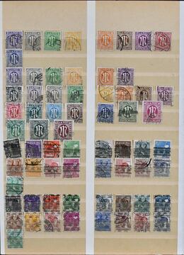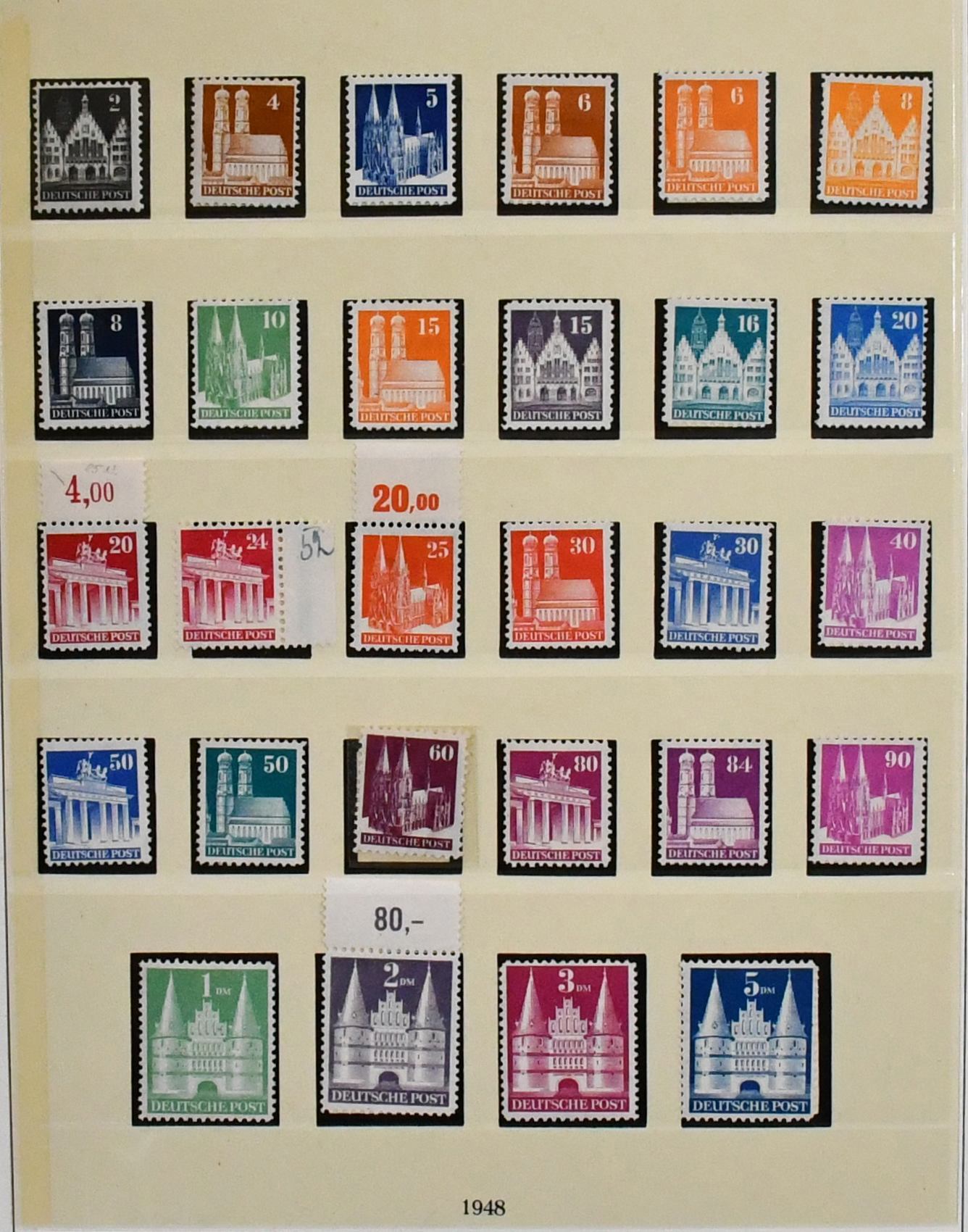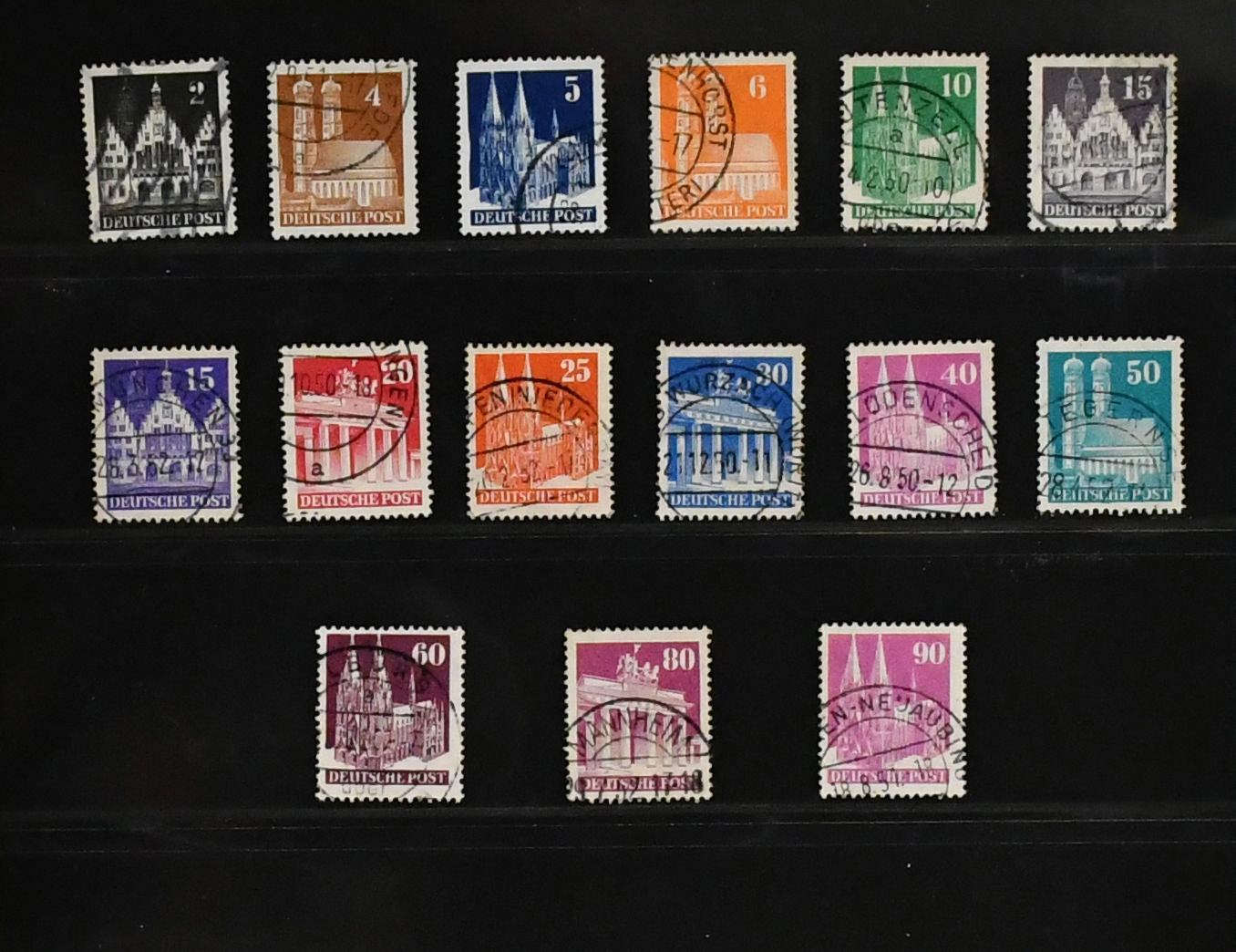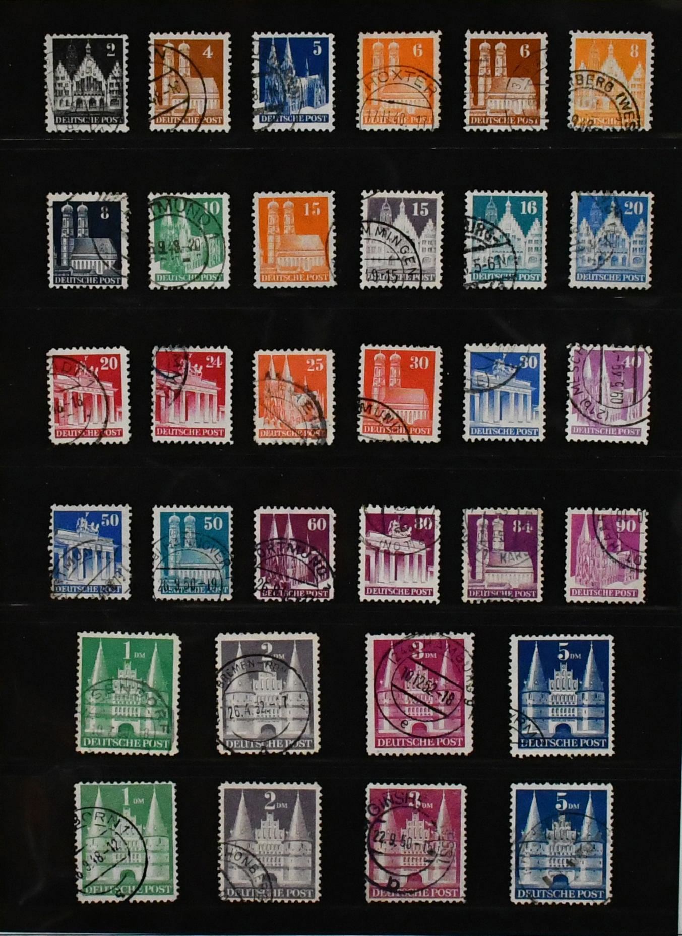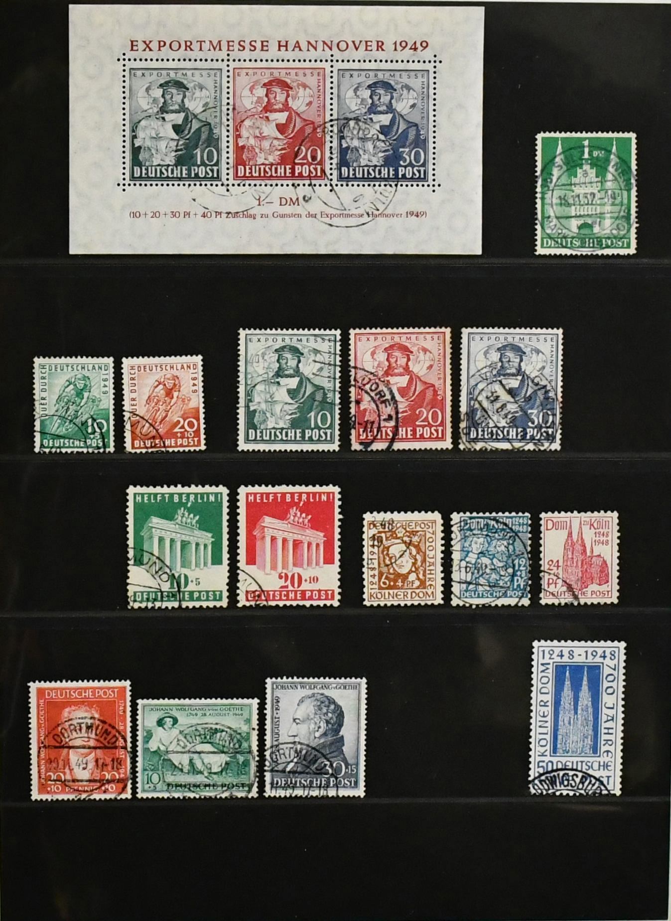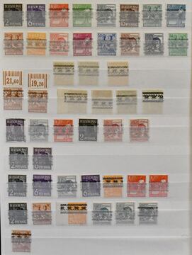 Bizone, 1945/1949, gest. Slg. ab AM-Post, mit Nr. 36/51I/II (Mi. 400,-), inkl. Nr. 49I, Bauten eg, wg und beiden Typen der Mark-Werte, Nr. 101/10, Bl. 1 mit Ortsstempel (Mi. 350,-), Einzelwerte aus Bl. 1 mit anhängenden Blockrändern inkl. 10 Pfg. per zwei (Mi. 240,-), Nr. 101/10 usw.