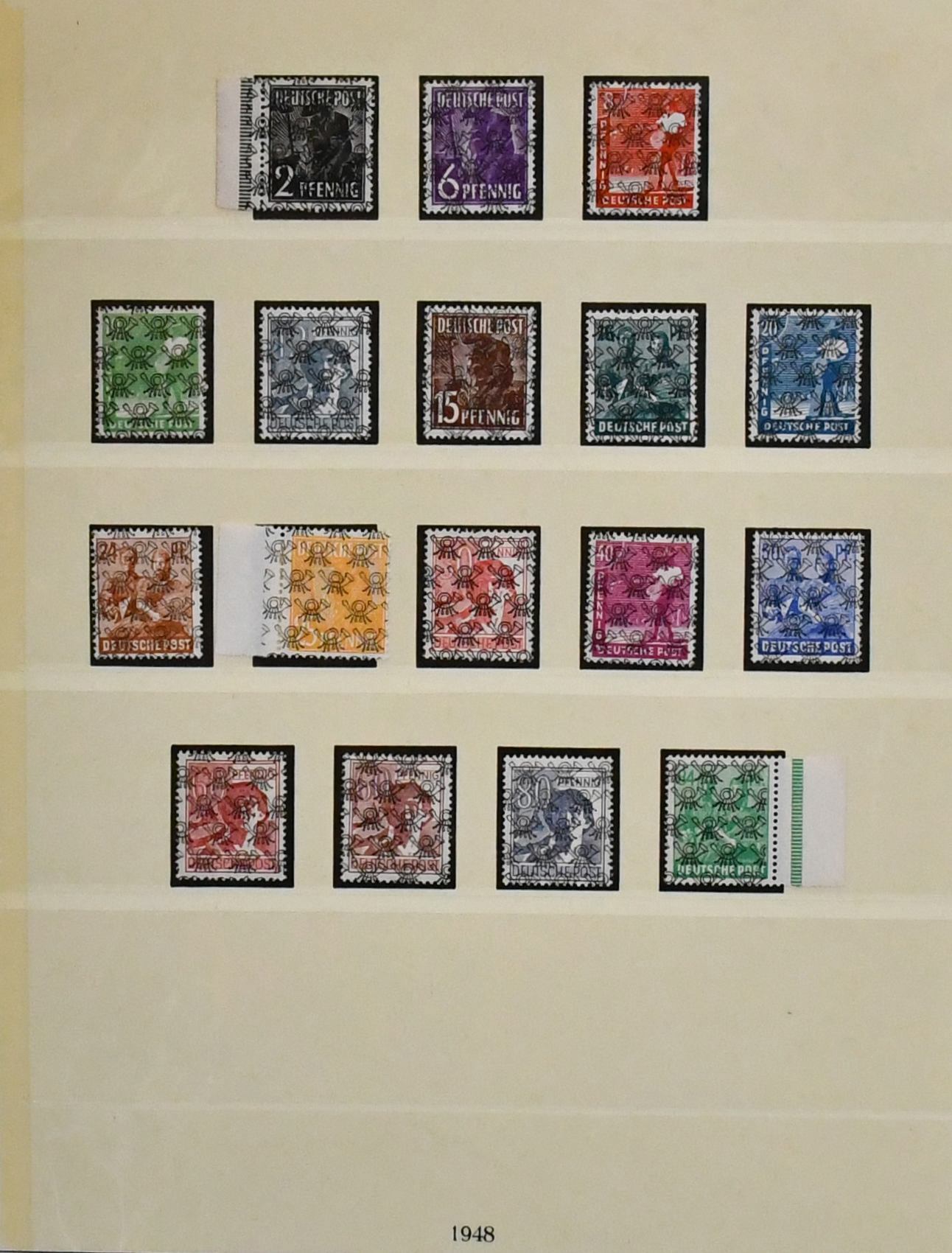 Bizone, 1945/49, gestempelte, von Nr. 1-110 (ohne Nr. 52/68) nahezu kpl. Sammlung auf Lindner-T-Vordrucken. Dabei Nr. 1/35 (Nr. 34/35 ungepr.), 36/51I/II (Mi. 400,-), Bauten eg/wg und beide Typen der Mark-Werte kpl., Nr. 101/10, Block 1 mit SST (tiefst gepr. Schlegel, Mi. 250,-) usw.