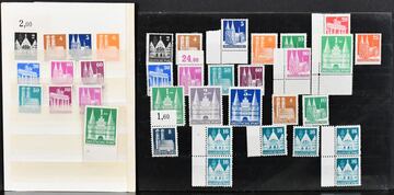 Bizone, Bauten, postfr. Zusammenstellung mit Nr. 97/98II und 100II (Mi. 330,-), 73/97 eg (ohne Nr. 94 eg, Mi. 610,-) usw. Dazu weitere Nr. 89/97 eg, inkl. Nr. 97 eg mit Plattennummer ungebr. (Mi. 450,-)