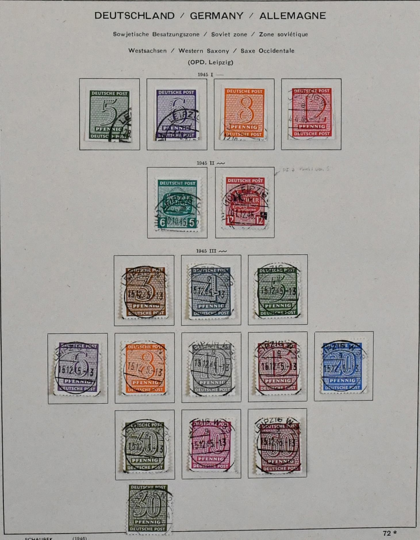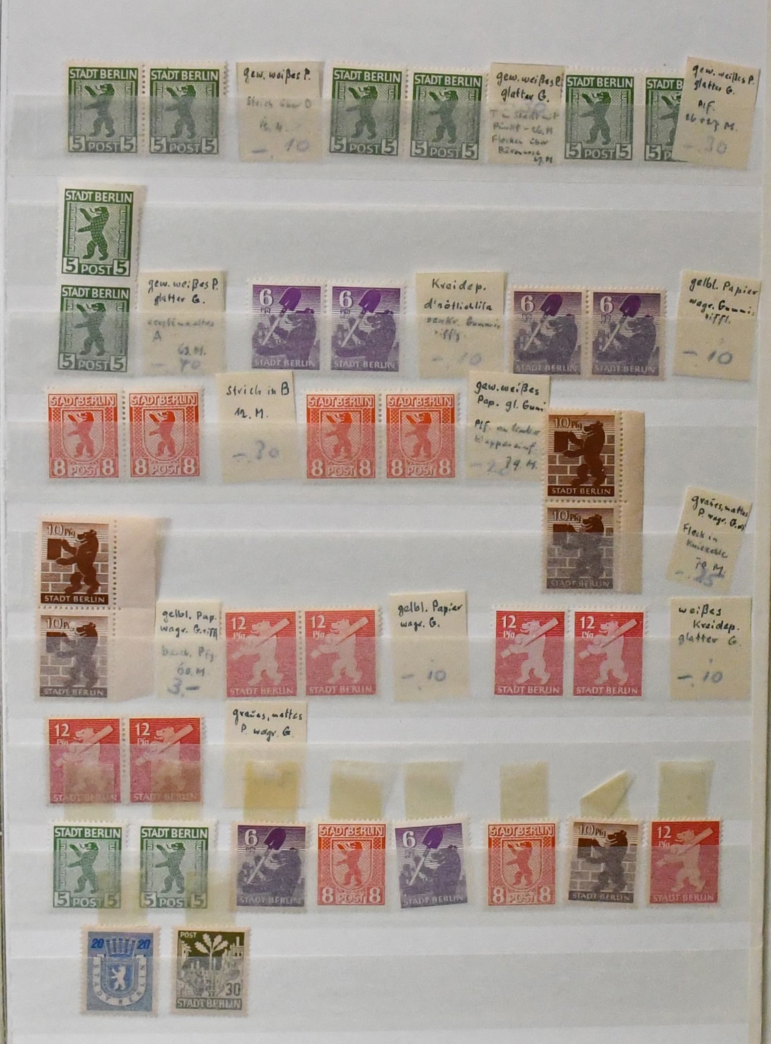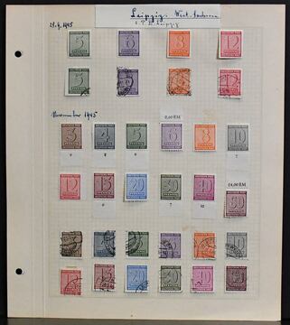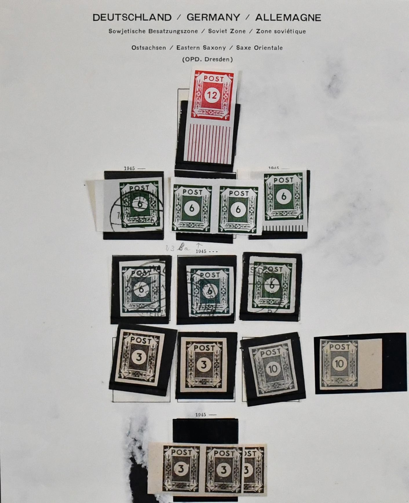 SBZ, Nachlaß-Slg. mit einer Vielzahl von Werten auf etwa 80 Albenblättern und meist Vordrucken. Dabei viele bessere Ausgaben, u.a. Nr. 19x/y postfr., 42/50 mit Postmeistertrennungen, 87/89B gest. (Mi. 180,-), Bl. 3A/B, etwa 100 ungeprüfte Bezirkshandstempel inkl. viermal heller 60 Pfg., Nr. 195 zweimal gest. (300,-) usw. Dazu gestempelte Nr. 150/55X mit ungepr. Stempeln