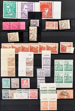 SBZ, Zusammenstellung mit Nr. 20/25 postfr. (Mi. 146,-), 35x im postfr. Bogenecken-Paar, Nr. 66/69 u. 71 postfr. mit Durchstich, 113b postfr., postfr. u. gest. Werte ex Nr. 116/18Y (Mi. 160,-), 165By im postfr. Viererblock usw.
