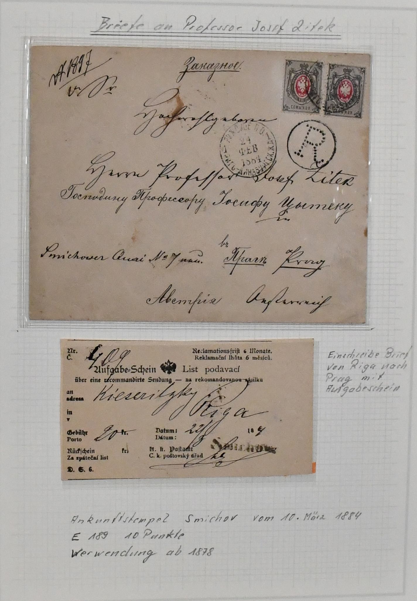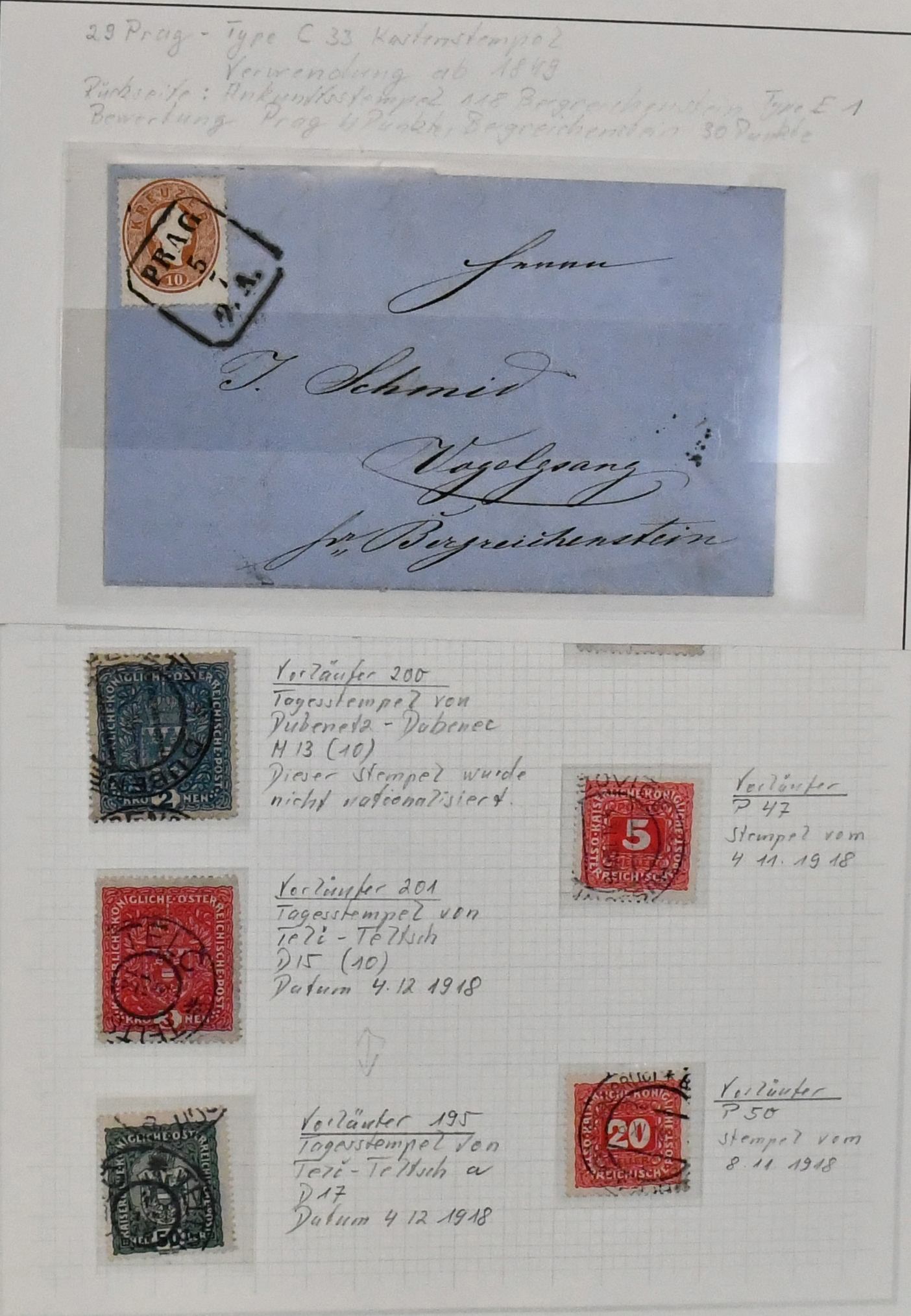 Tschechoslowakei, alte Ausstellungssammlung im Leuchtturm-Album, beginnend mit einigen klassischen Belegen europäischer Staaten nach Prag, ferner Hradschin-Ausgabe auf Paketkarten-Abschnitten, Bahnpoststempel usw. Die Seiten teilweise nicht mehr kpl., aber mit vielen interessanten Stücken