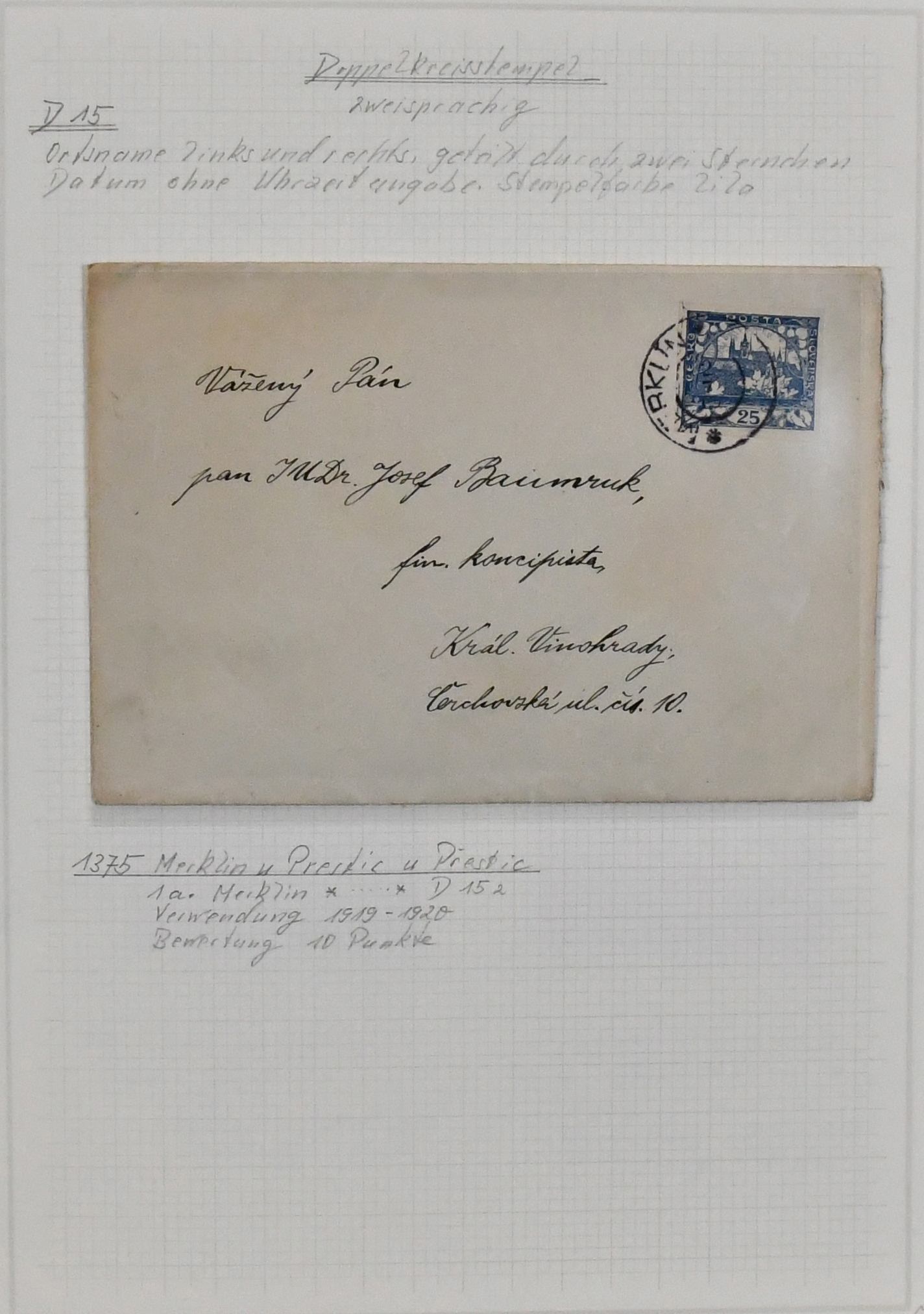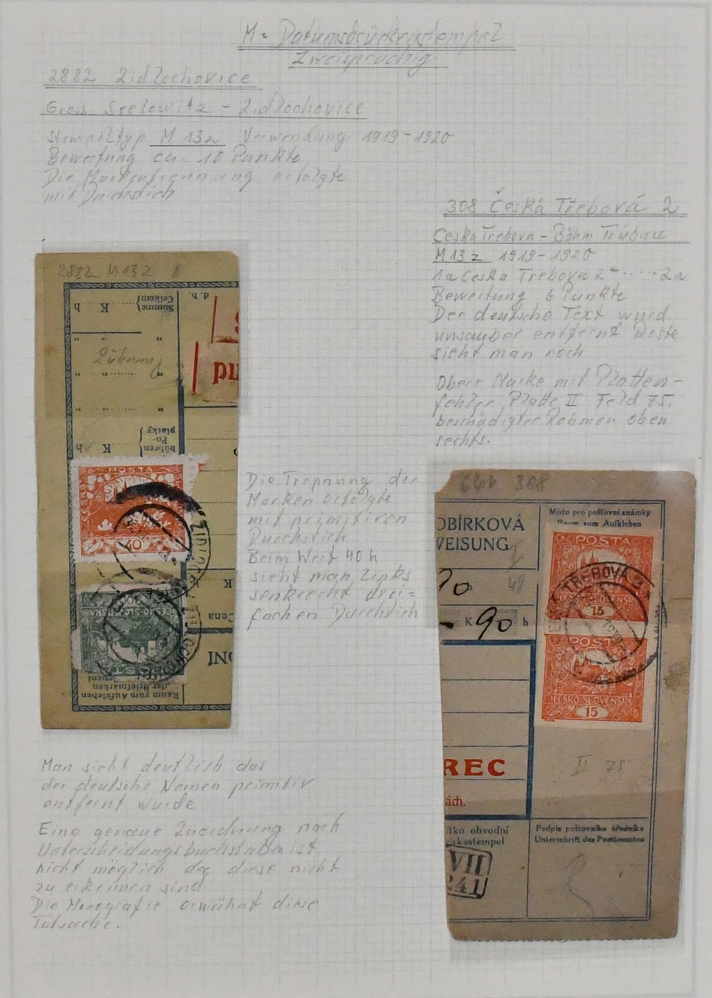Tschechoslowakei, um 1920, Stempelsammlung von "A" bis "Z", meist auf Paketkarten-Abschnitten mit Hradschin-Frankatur (viele hundert Stück), gutes Referenzmaterial, zustäzlich Stempel-Slg. des Gebietes auf losen Marken Kaiserreich Österreich (meist um 1910-1918)